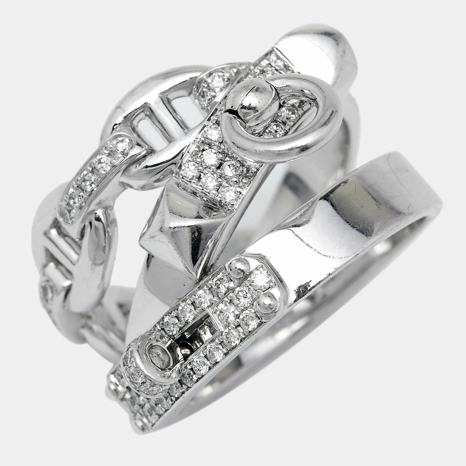 The Hermes Alchimie ring comes as a deconstructed design of three bands each distinct in its own way. The ring is made of 18k white gold and its value is raised by the company of diamonds that sparkle with the wearer. This Hermes fine jewelry ring is a tribute to the House’s coveted motifs and its long history of excellence.