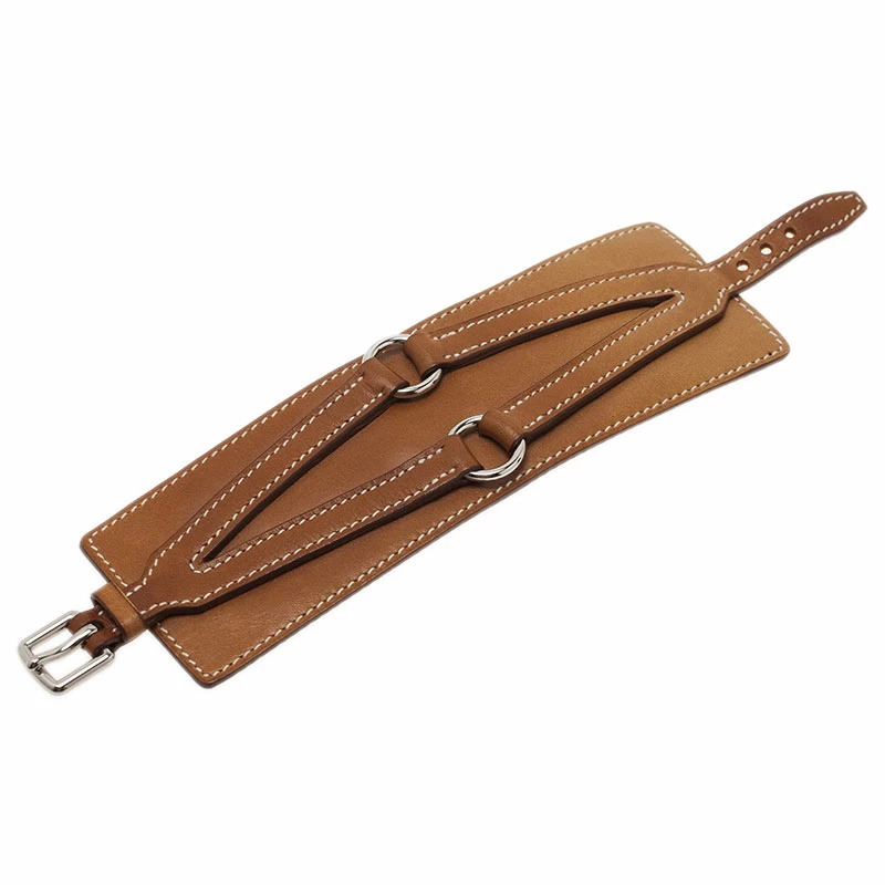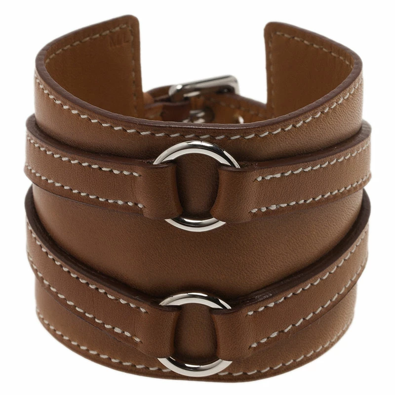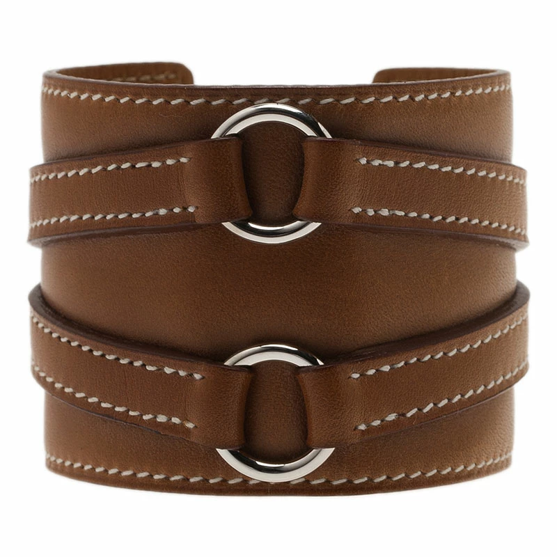 Pair this chunky Hermes bracelet with your casual outfits. It is made from brown leather with contrasting white stitched details. Featuring two straps supporting silver-tone rings, it fixes on the wrist with a pin buckle fastening.