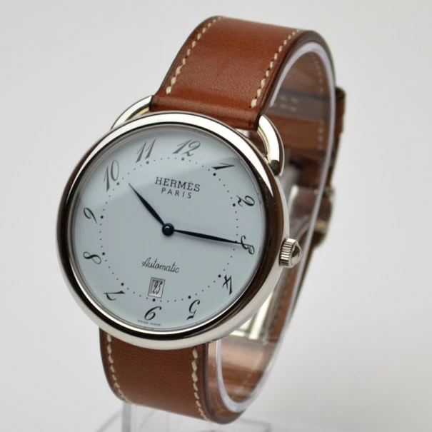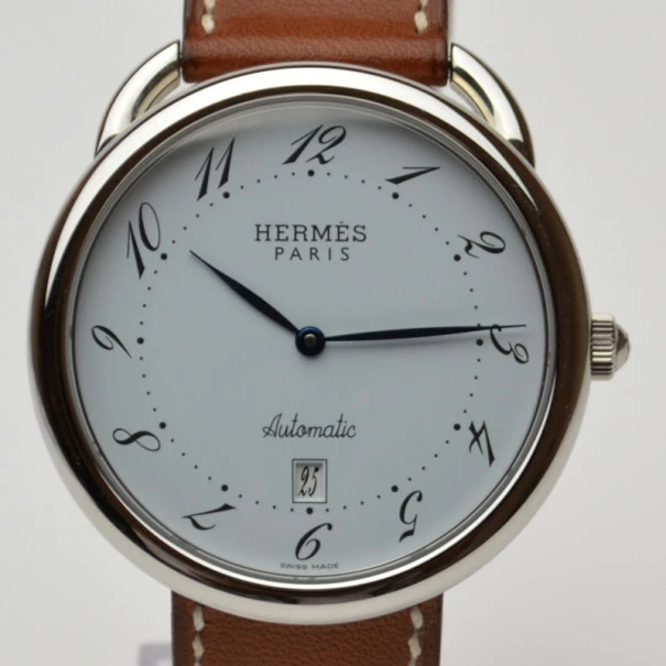 This firm timepiece from Hermes is truly majestic. The big dial in white houses black italicized Arabic numerals, a minute track, a date window and polished blue hands. The stainless steel case features scratch resistant sapphire crystal glass. The brown leather strap fixes on the wrist thanks to a hidden deployment clasp. Water resistant up to 50m/150ft, this Swiss masterpiece is a must have for any avid collector.Gender: MenOriginal Retail Price: USD $4,100Condition: Gently Used (This watch has minor scratches on the case and buckle with minor signs of use on strap)Case size: 41mmBand material: Calfskin LeatherMovement: AutomaticCase material: Stainless SteelBezel: Stainless SteelIncludes: Original Box, Documents