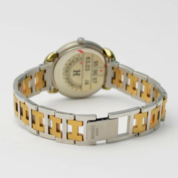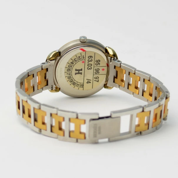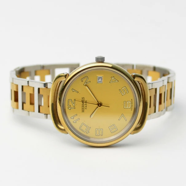 Wear this versatile Hermes Arceau Wristwatch at any occasion and with any outfit! It features a round gold dial that hosts Arabic numerals, sword style luminous hands and a date window. This timepiece includes a gold bezel encrusted in a stainless steel case. The signature style ‘H’ link strap in gold and silver and Hermes deployment clasp closure add the finishing touches to this timeless creation.Gender: UnisexOriginal Retail Price: US $1,742Condition: NewCase Size: 32 MMBand Material: Stainless SteelBand Size: 21 CMMovement: QuartzCase Material: Stainless SteelIncludes: The Luxury closet Watch Box