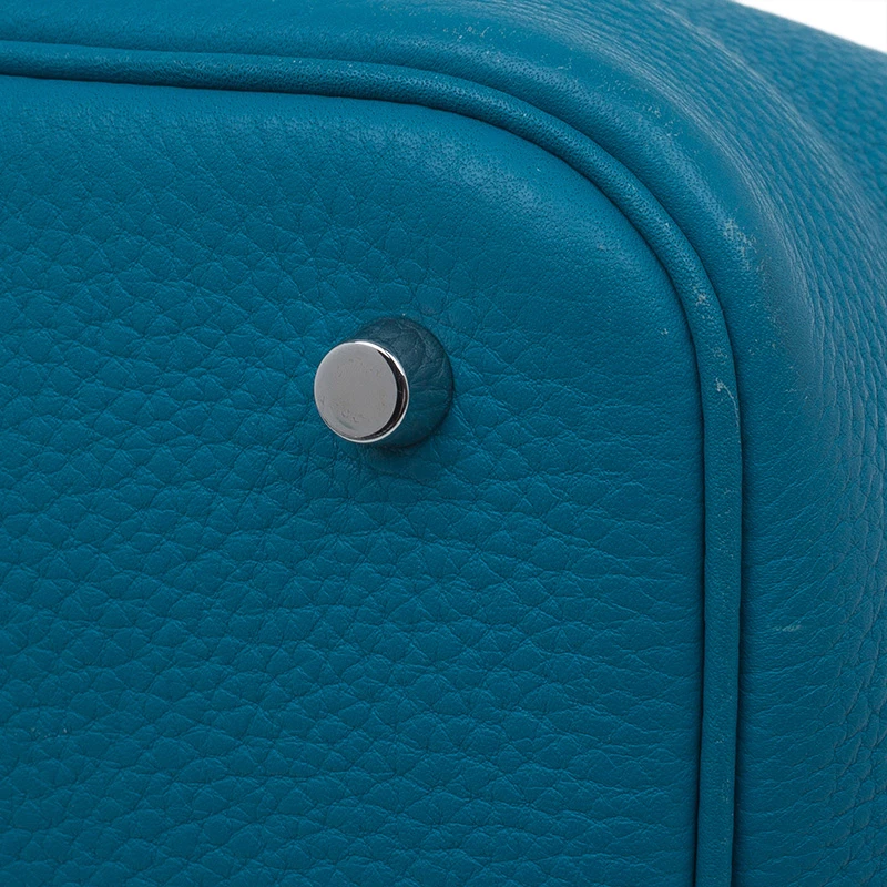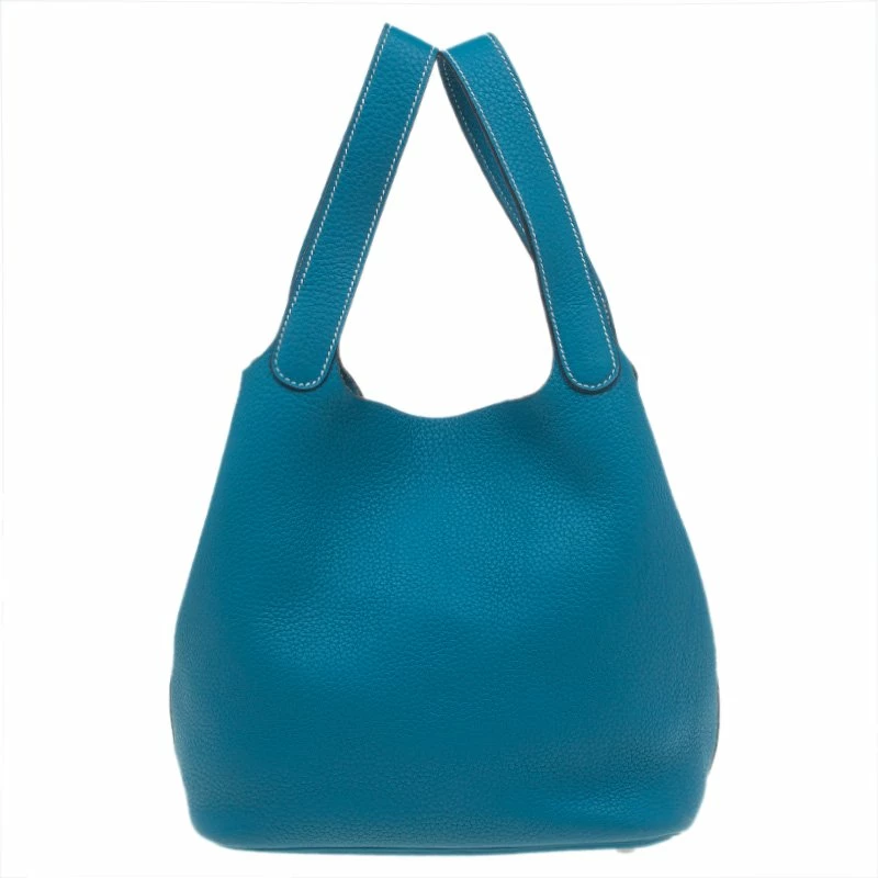Sober up with this superbly designed Hermes Picotin MM bag. It has been crafted in blue Clemence leather and features double top handles. The bottom has protective feet. Secured with a weight closure, the leather lined interior is very accommodating.