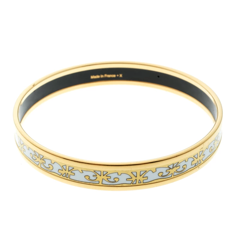 Beautify your wrist with this stunner of a bracelet from Hermes. The piece has been crafted from gold-plated metal and designed with enamel prints all around the exterior. This bracelet is complete with the iconic label on the inside of the band.