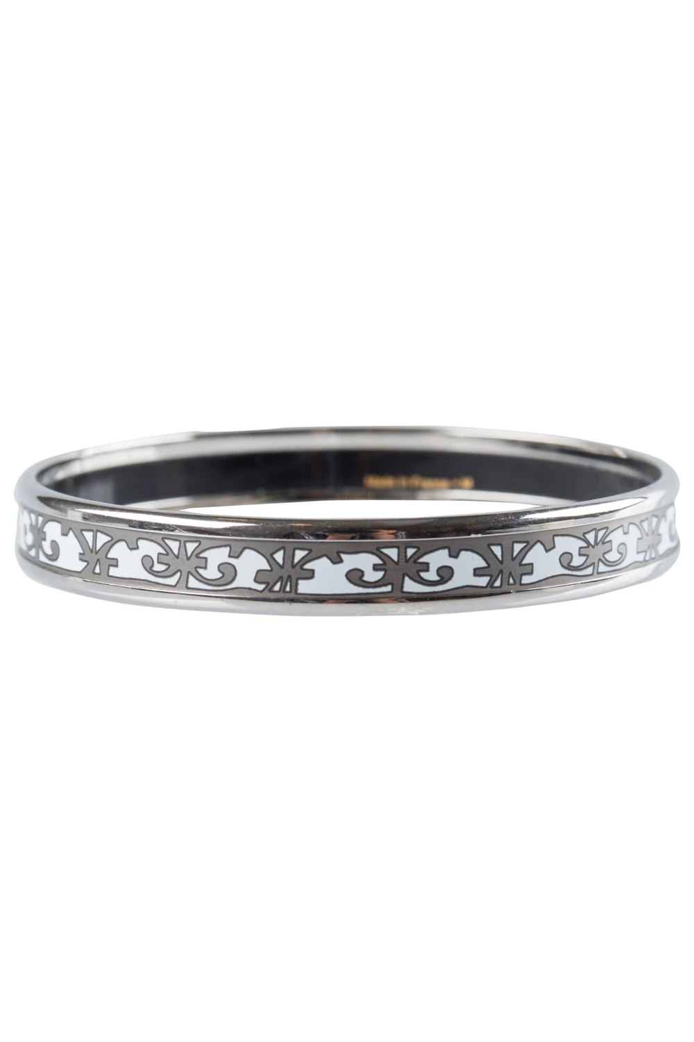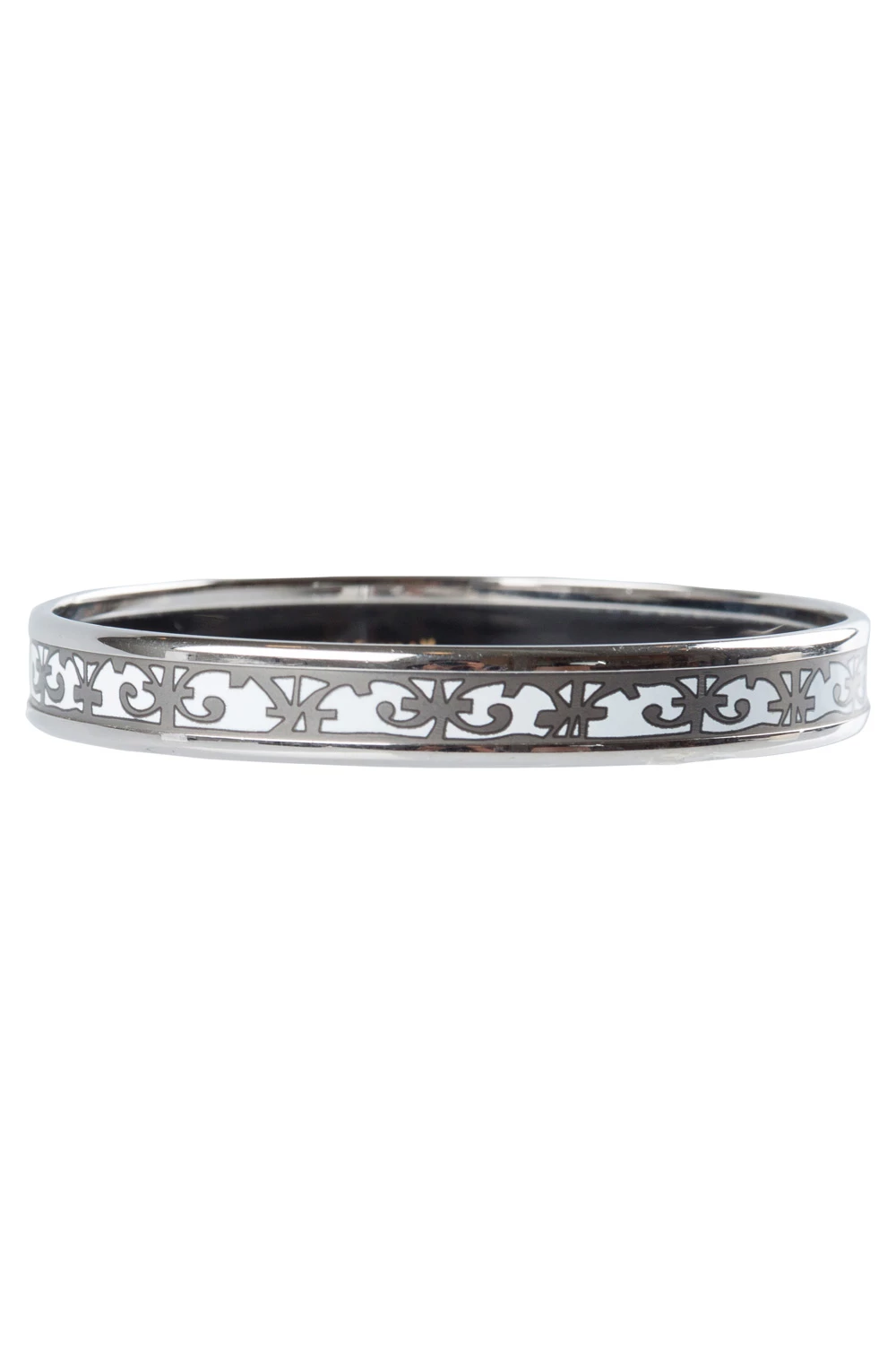 Beautify your wrist with this stunner of a bracelet from Hermes. The piece has been crafted from palladium-plated metal and designed with enamel prints all around the exterior. This bracelet is complete with the iconic label on the inside of the band.