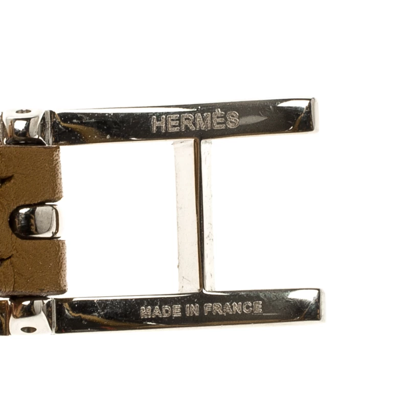 Designed in behapi brown and orange leather, this Double Tour bracelet is a classic and loved design from the house of Hermes. This bracelet is further accented with a H shaped silver tone buckle on the end with adjustable holes on the other side for a signature Hermes look that can be worn on both sides and different colours.