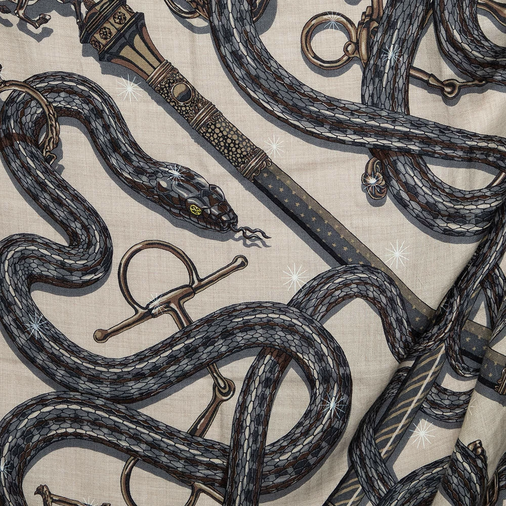You are bound to impress onlookers with this scarf from Hérmes. Luxuriously cut from silk & cashmere in France, the scarf has a gorgeous print all over its square expanse, and every accent on the piece speaks royalty. The scarf is complete with the brand label on it.