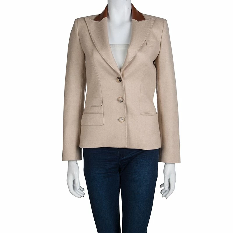 A perfect piece for semi-formal occasions, this beige blazer from the house of Hermes features notched lapels collar with leather trim detailing at the collar. Featuring slip pockets and flap pockets in the front, this well-tailored blazer has a three-buttoned front closure as well as buttoned cuffs.