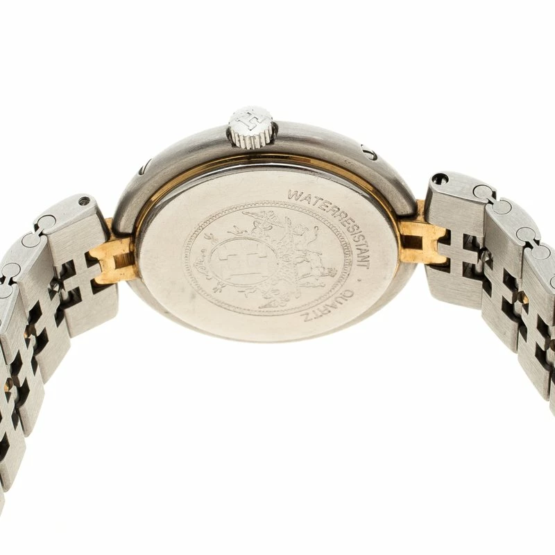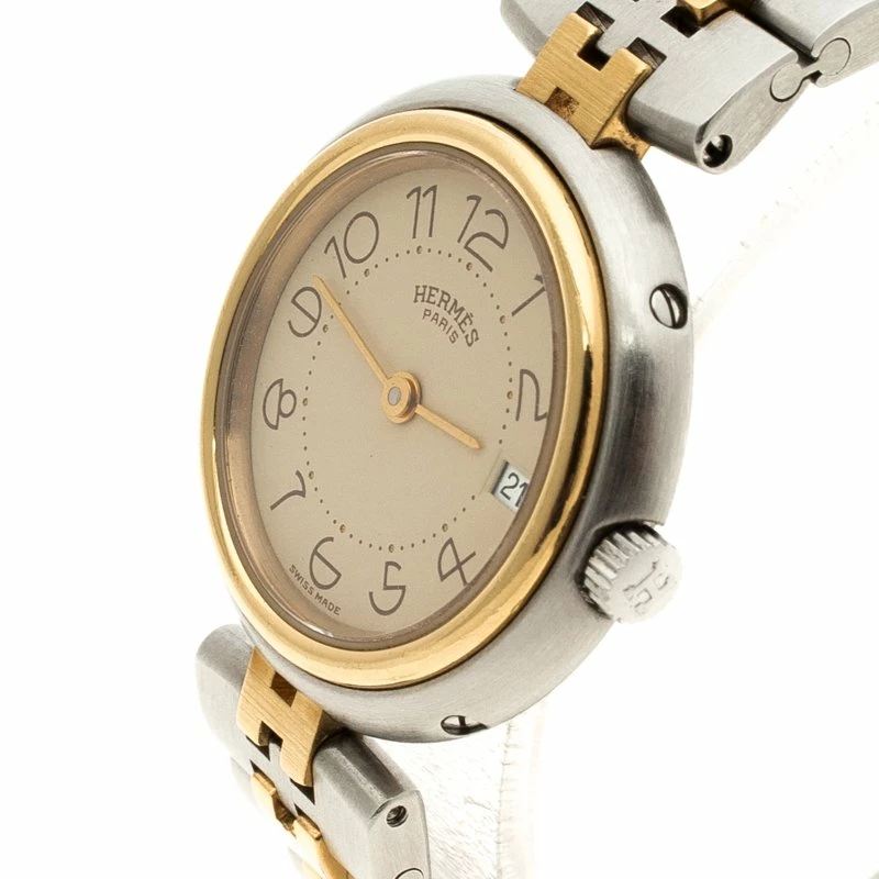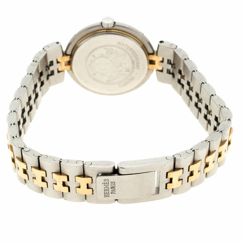 Hermes Clipper wristwatch has a charm and looks classy! A stainless steel case and a solid gold-tone bezel hold a gold-tone dial at the center. The two-tone bracelet with ‘H shaped’ inserts at the center adds to the look. A screw-down crown, solid case back and a scratch-resistant sapphire crystal makes this watch a sturdy option to wear all day long.