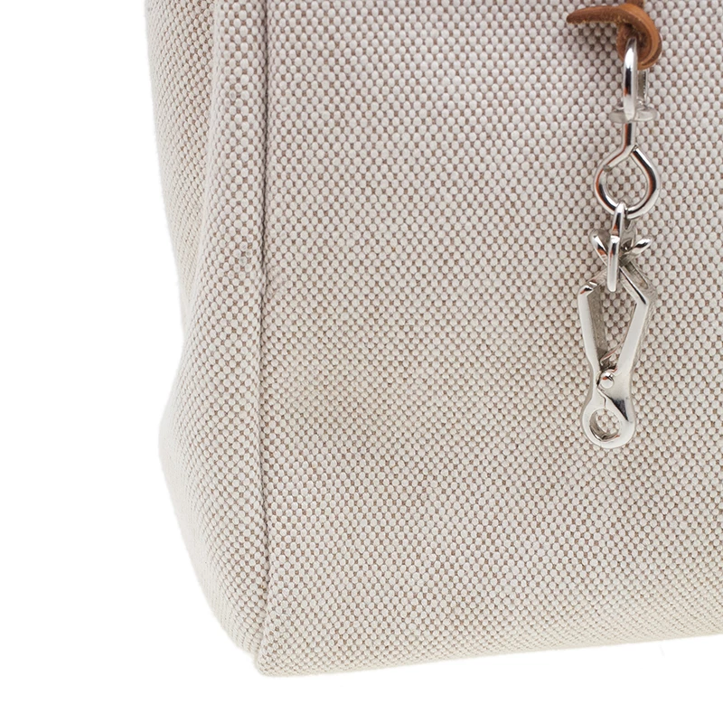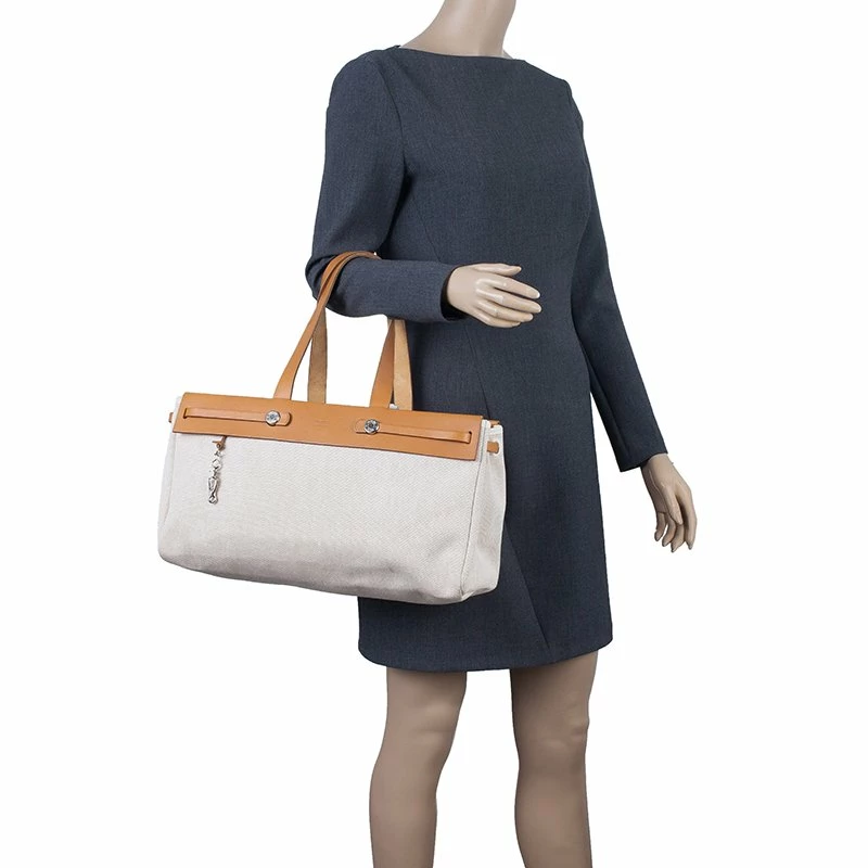 Carry this chic and functional Herbag by Hermes along with you everywhere. The stylish design has a smooth structured tan leather top with a beige canvas body that can be switched up between a small and a large bag. The look is completed with flap front closure, and Hermes’s signature top handles. Its roomy open interior is unlined and will comfortably hold all of your daily necessities!