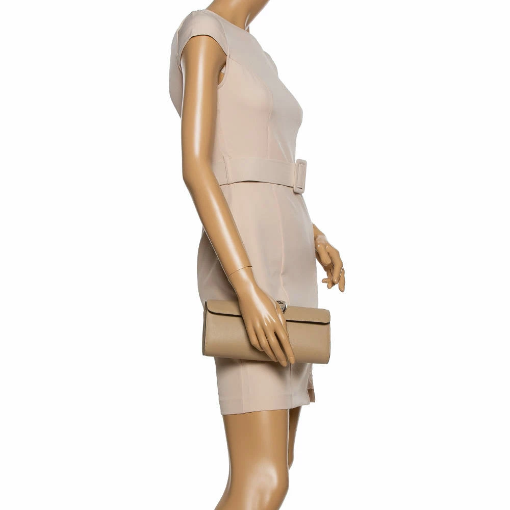 With style and efficiency in every stitch, a bag by Hermes is the epitome of sophistication that delivers timeless ensembles. This Egee clutch translates the brand’s meticulous attention to detail into a possession that will be cherished. Crafted from quality leather in France, this beige creation has a foldover top that opens to a leather interior. It has a barrel shape and silver-tone hardware detailing in the front.