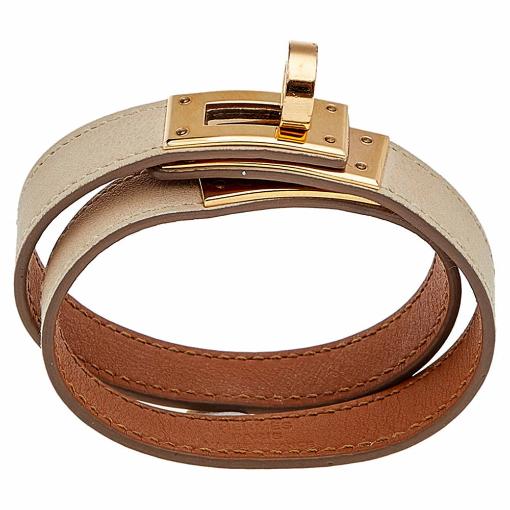 This Hermés Double Tour wrap bracelet is a chic accessory that can be paired with everything, from casuals to evening outfits. Made from leather, it is beautified with a Kelly twist closure in gold-plated metal. The bracelet has a long strap that wraps around your wrist twice.