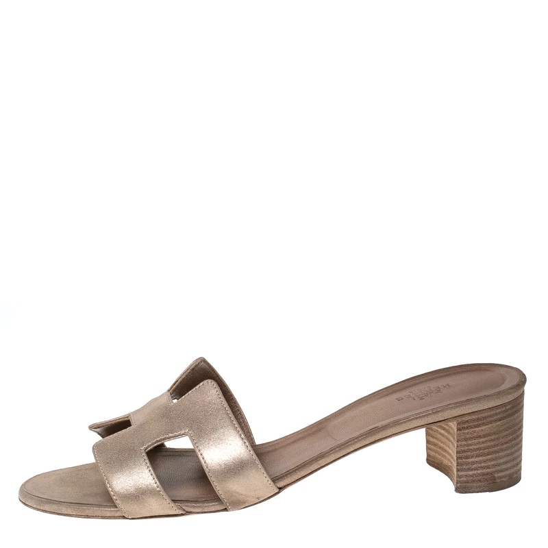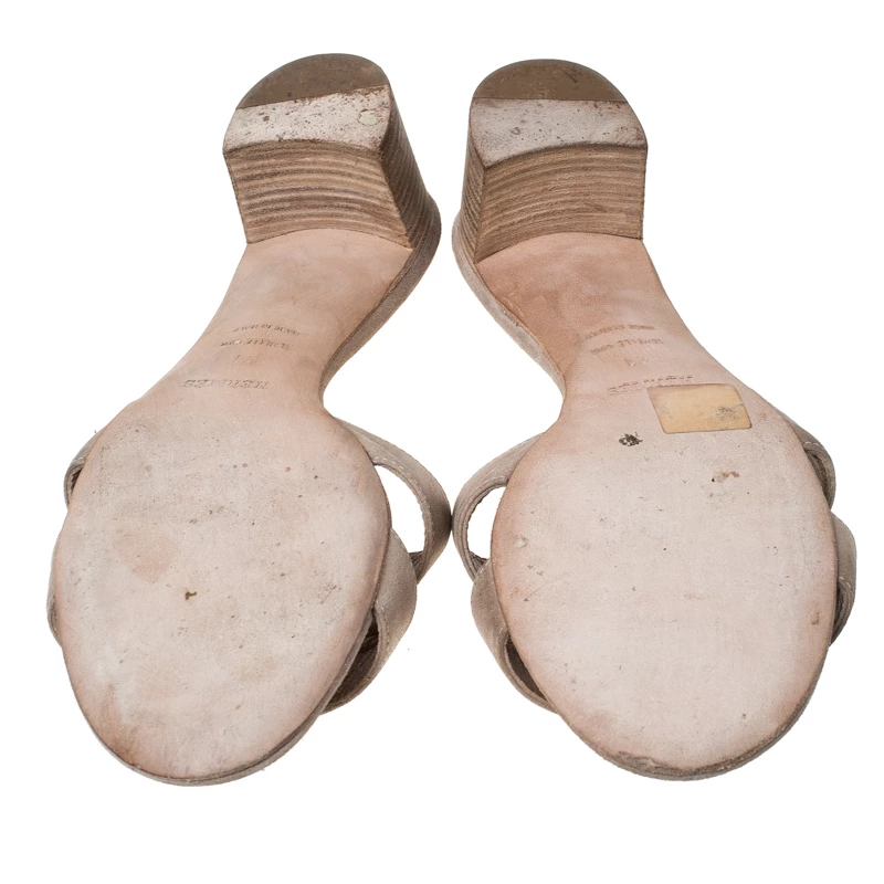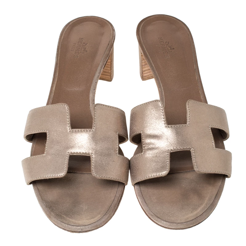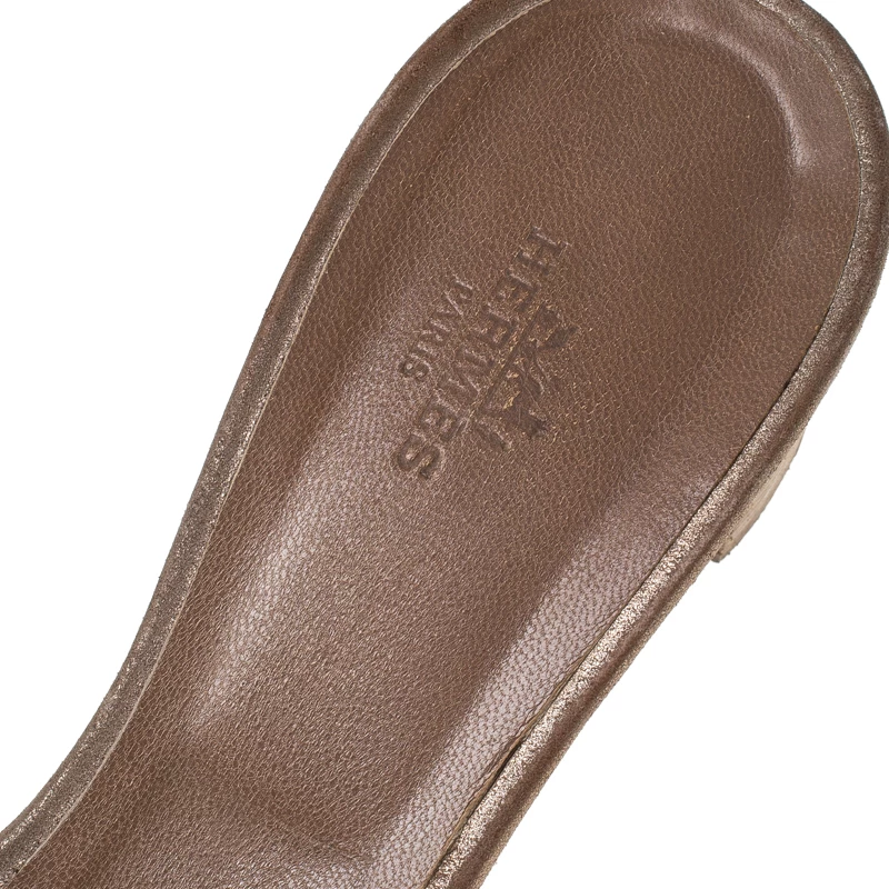 Put your best foot forward this season in these pretty Hermes sandals. These metallic beige Oran sandals have been crafted from textured nubuck leather in Italy and they feature the iconic H on the vamps as well as insoles meant to provide comfort at every step. These sandals, complete with low heels, are sure to attract admirers!