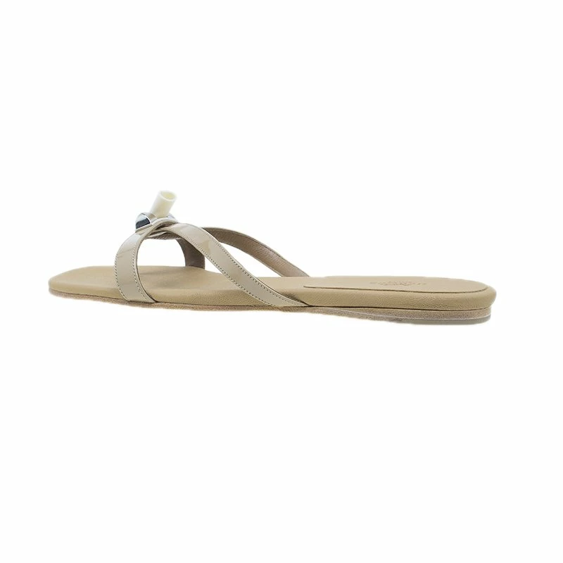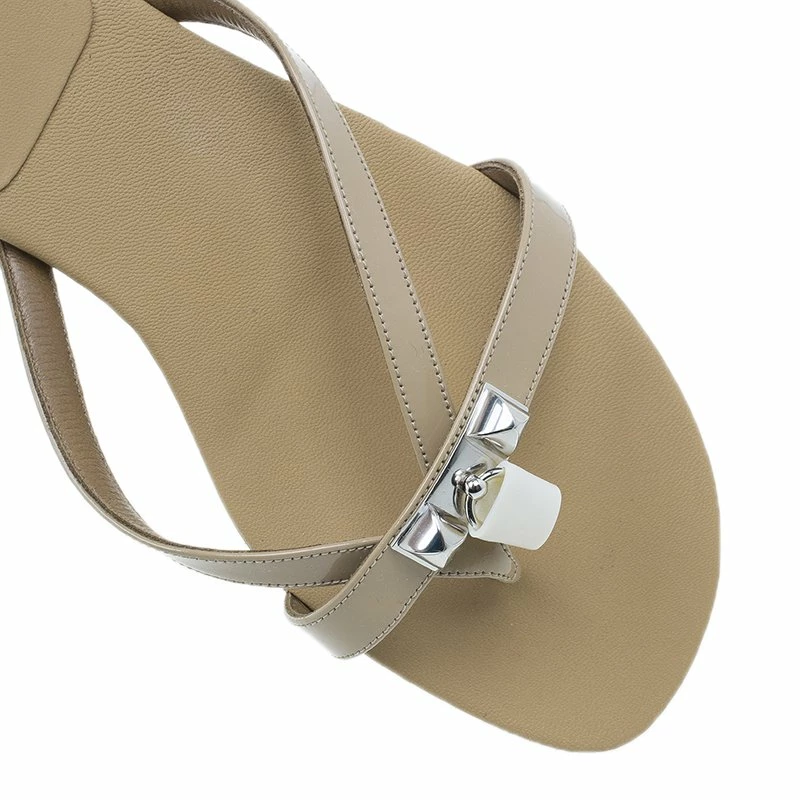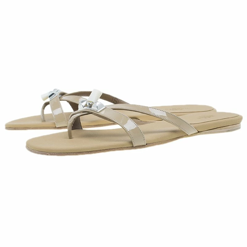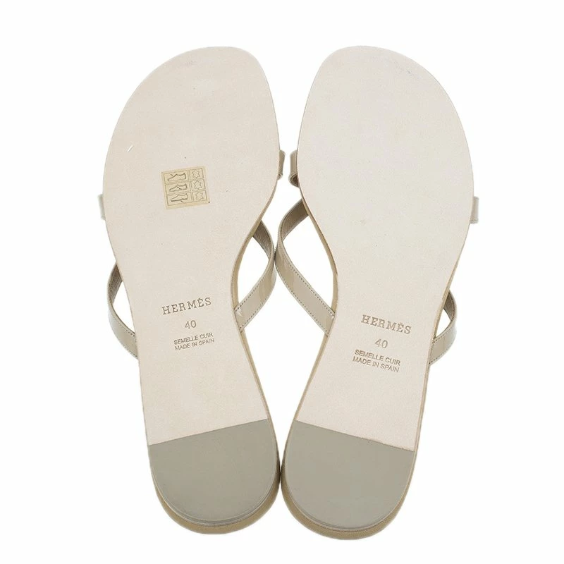 Perfect for relaxed summer days are these Corfou Thong sandals by Hermes. Crafted from beige patent leather, they feature two “Clous Pyramides” hardware in palladium plated metal at the vamps. The insoles are leather lined with brand labels.