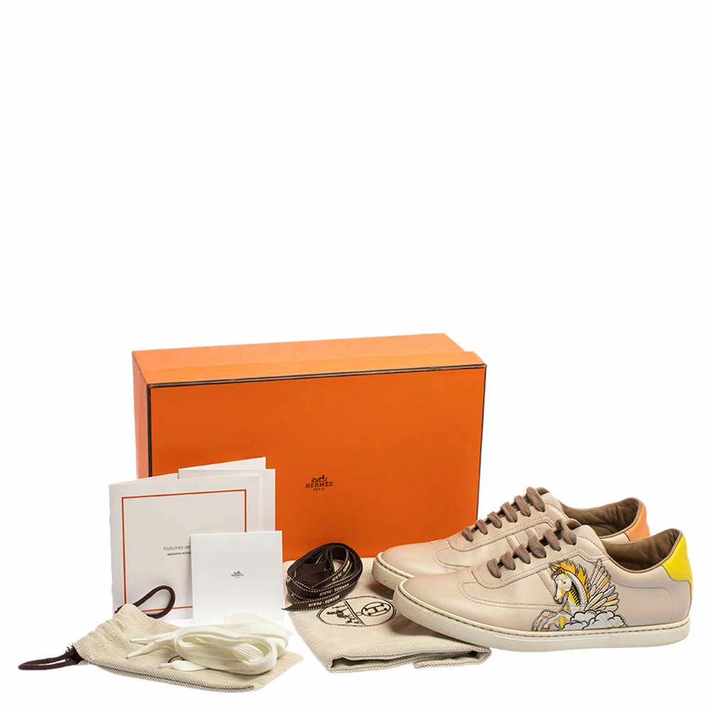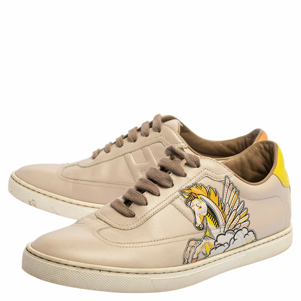 Very stylish and absolutely trendy, these Quicker low top sneakers from Hermes come crafted from beige leather. They are styled with round toes, lace-ups on the vamps, a ‘Pegase Pop’ print on the sides, and logo details on the counters. They are complete with comfortable leather-lined insoles and durable rubber outsoles.