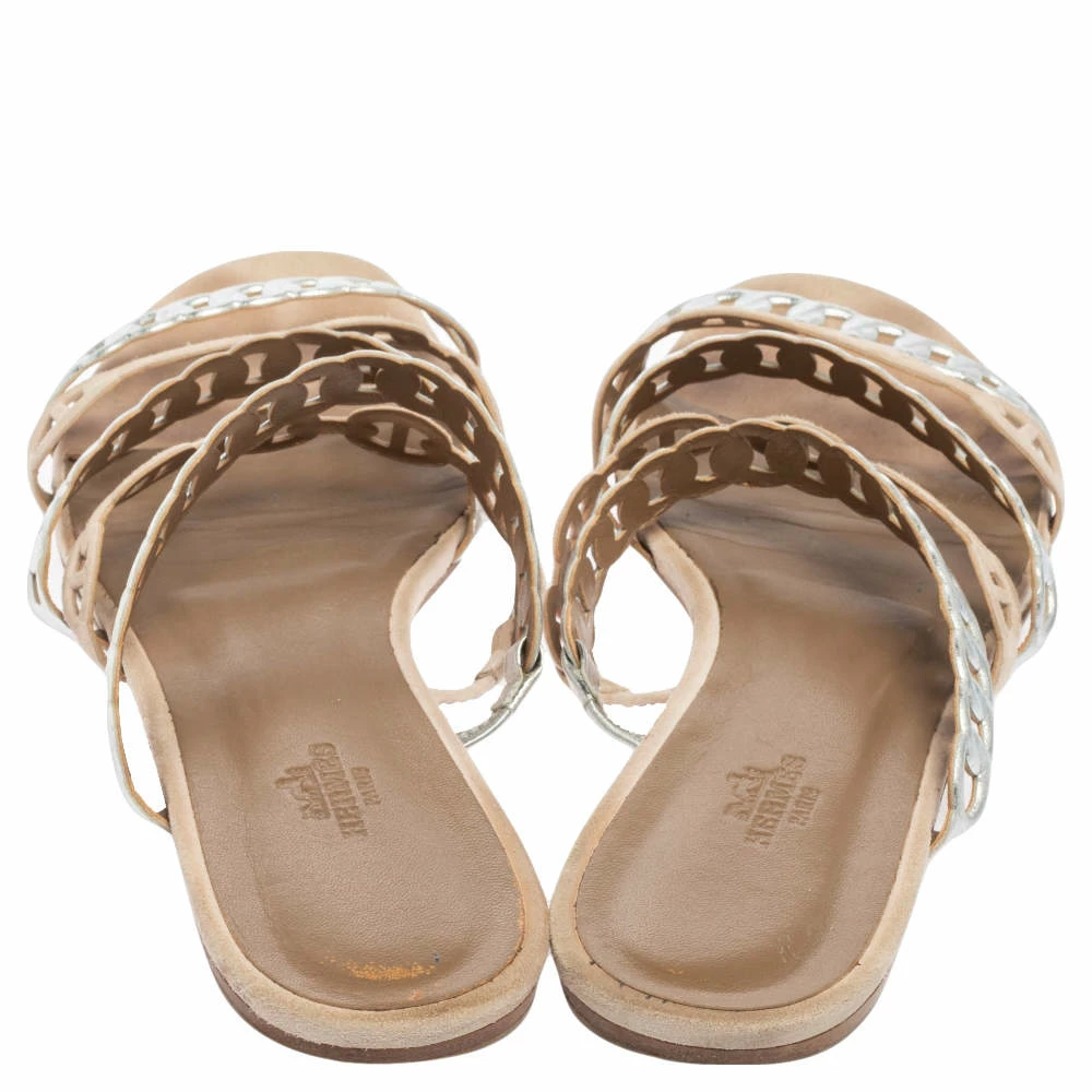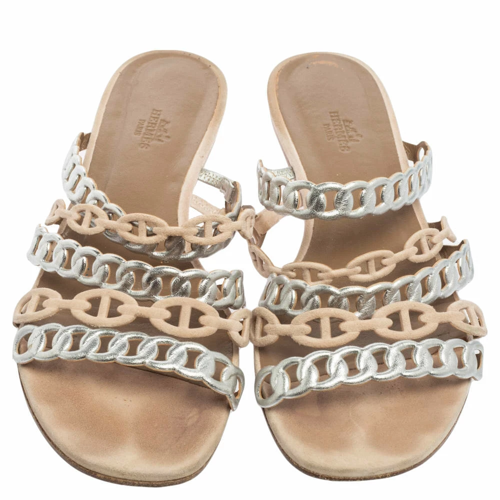 How stylish and chic do these D’ancre Chaine sandals from Hermes look! These flat sandals have an open-toe silhouette featuring multiple straps across the vamps that resemble interlocking chains. Grab them today and experience comfort like never before.