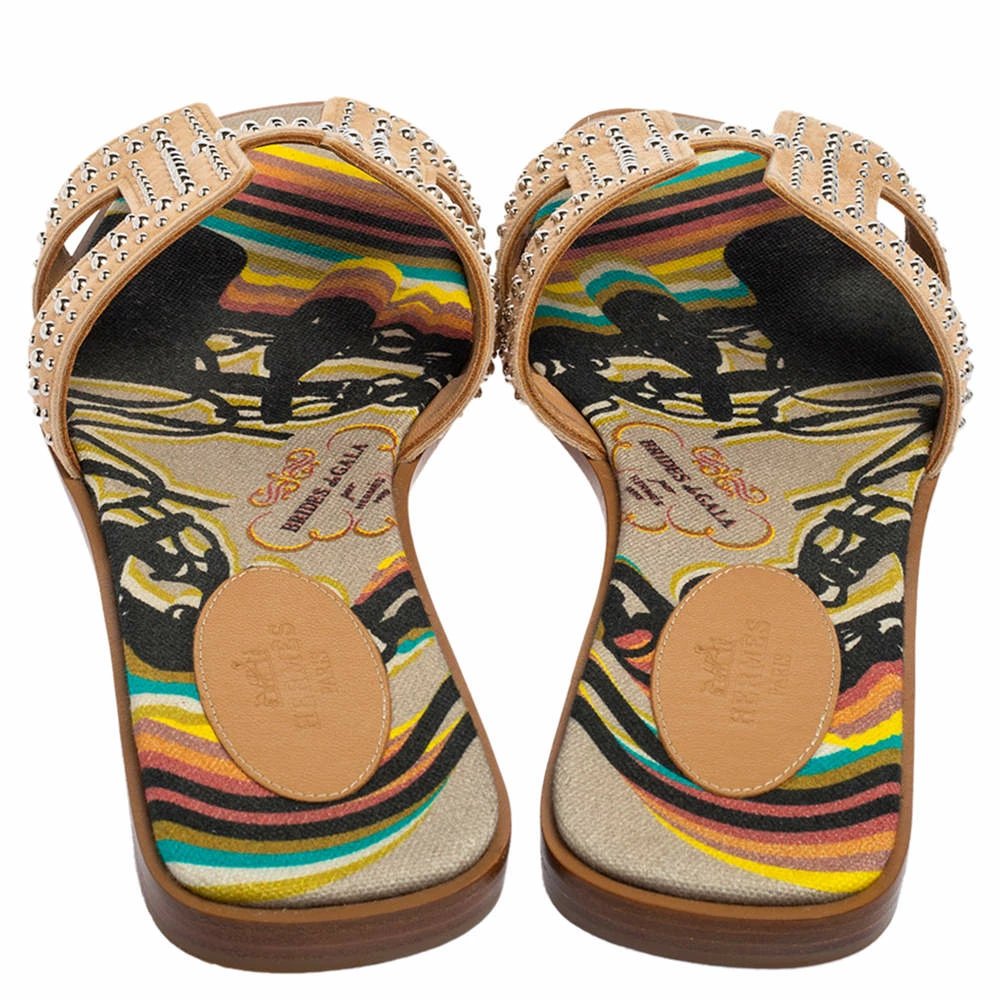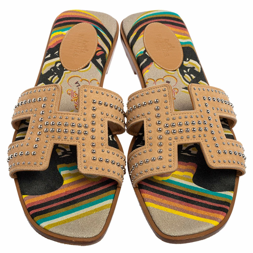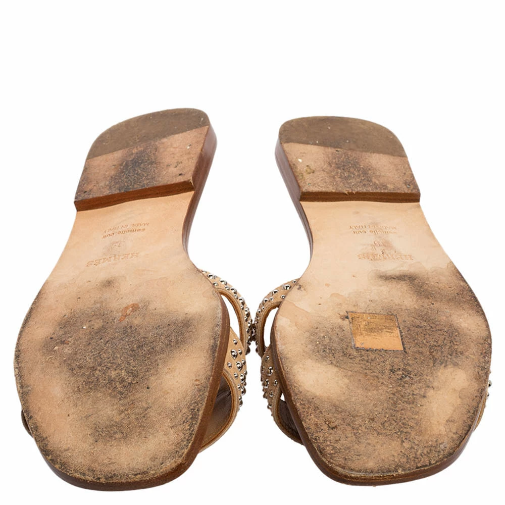 Put your best foot forward this season in these pretty Hermès sandals. These beige-hued Oran sandals have been crafted from quality suede then accented with studs and they feature the iconic H on the vamps as well as insoles meant to provide comfort at every step. These sandals are sure to attract admirers!
