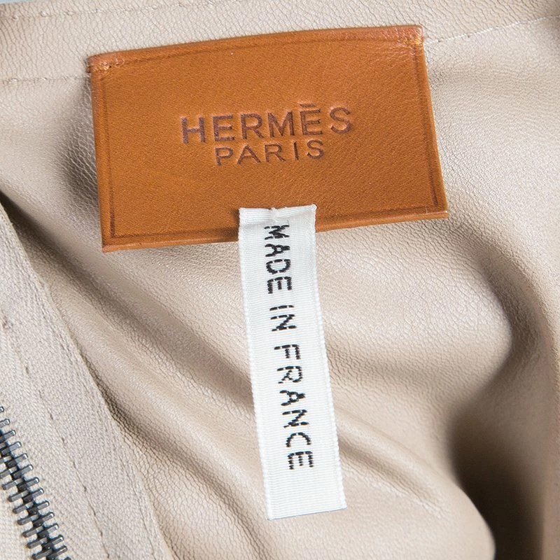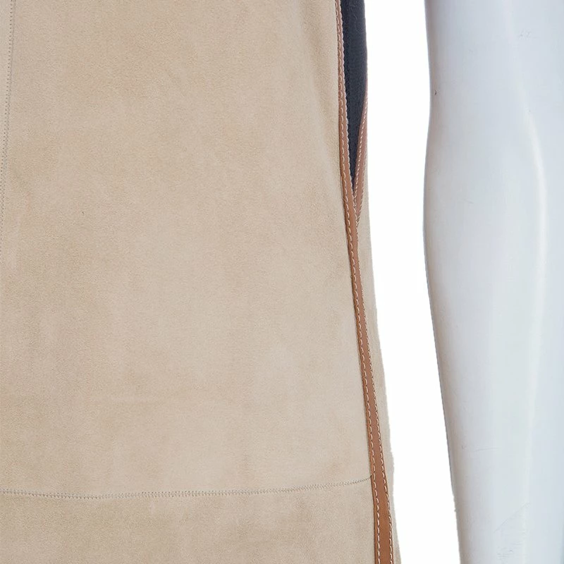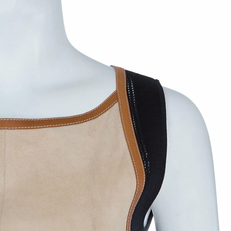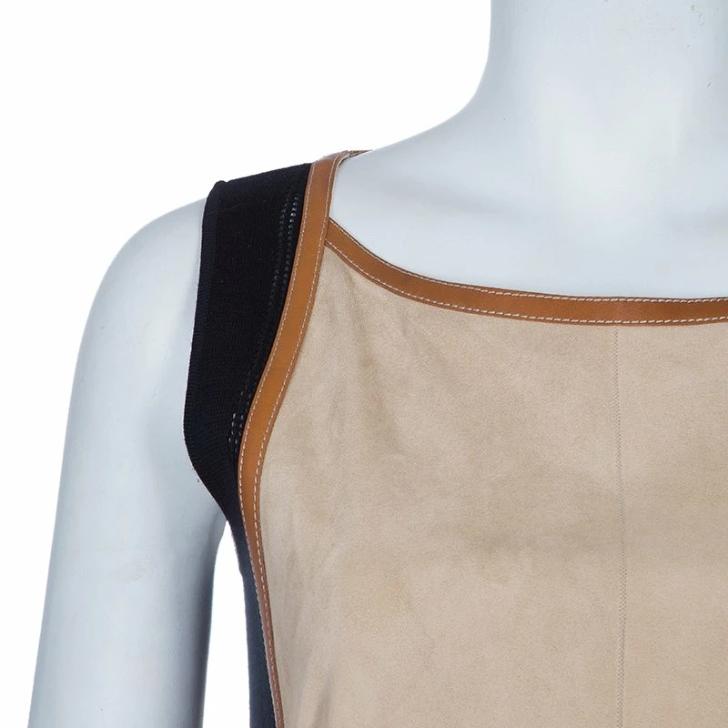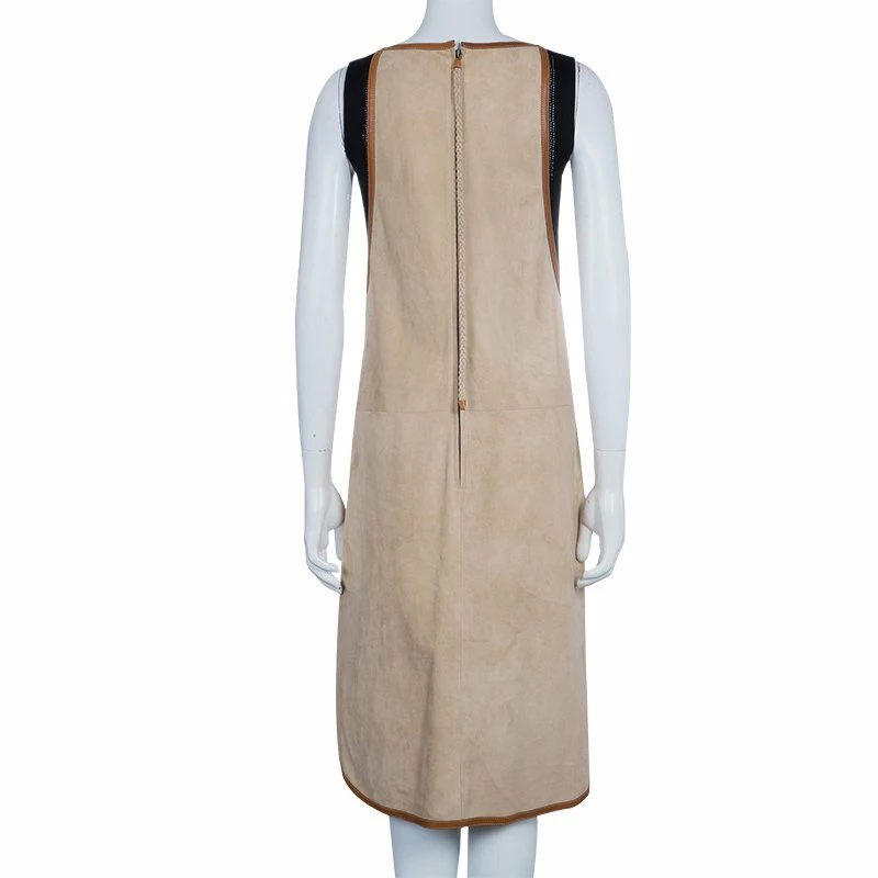 This chic and stylish dress from the fashion house of Hermes. The body is made from goatskin and calfskin leather and the piping has a wool detailing. The sleeveless dress features boat neck, back zipper, and a mid-length hem.