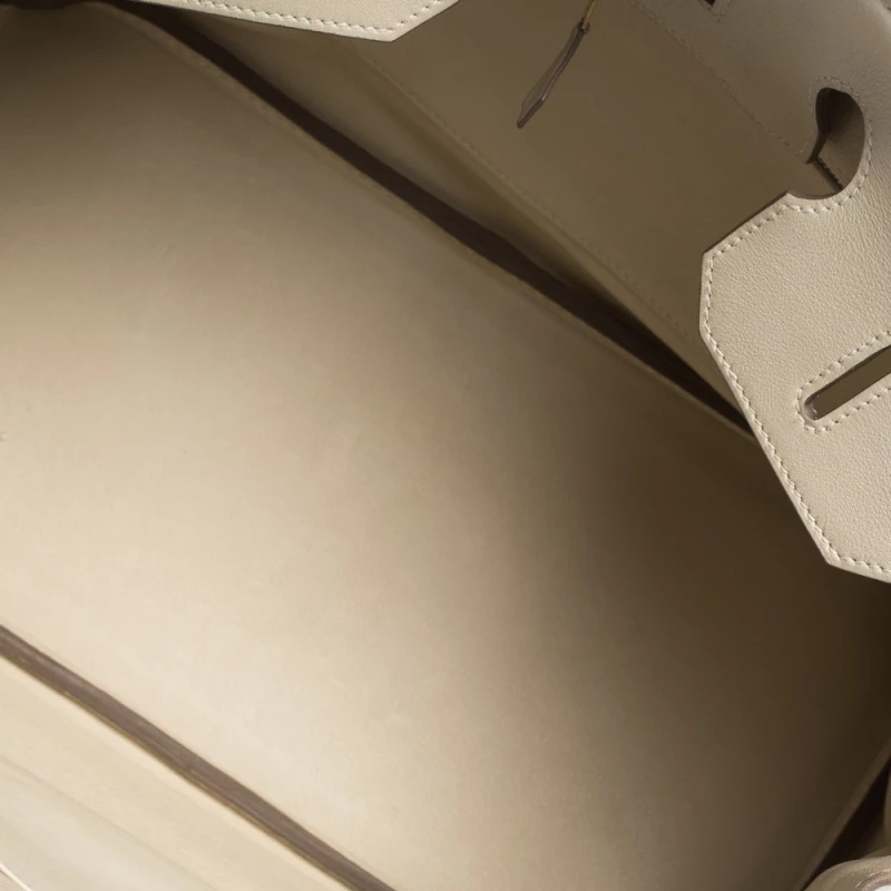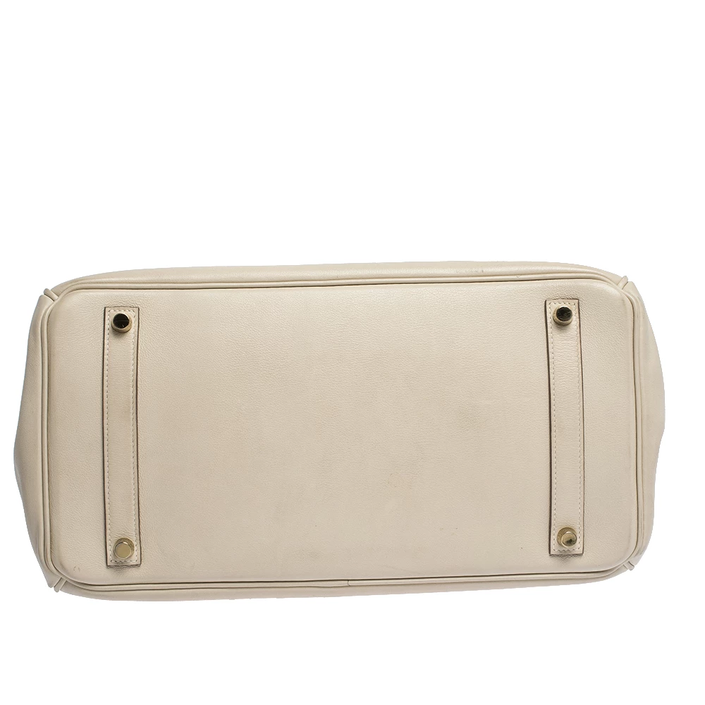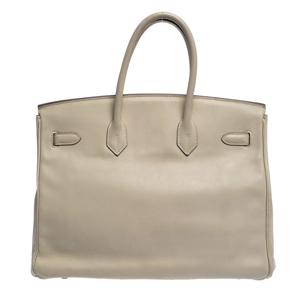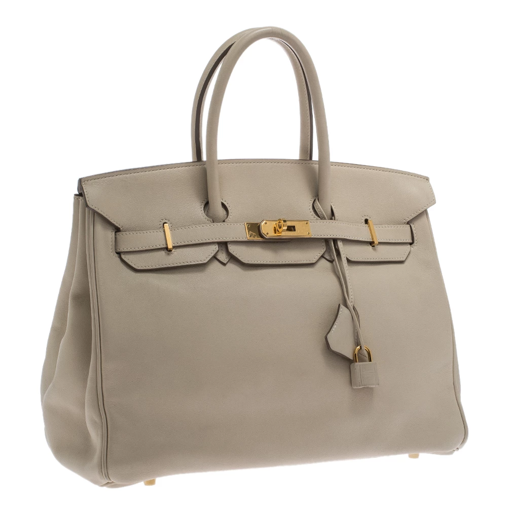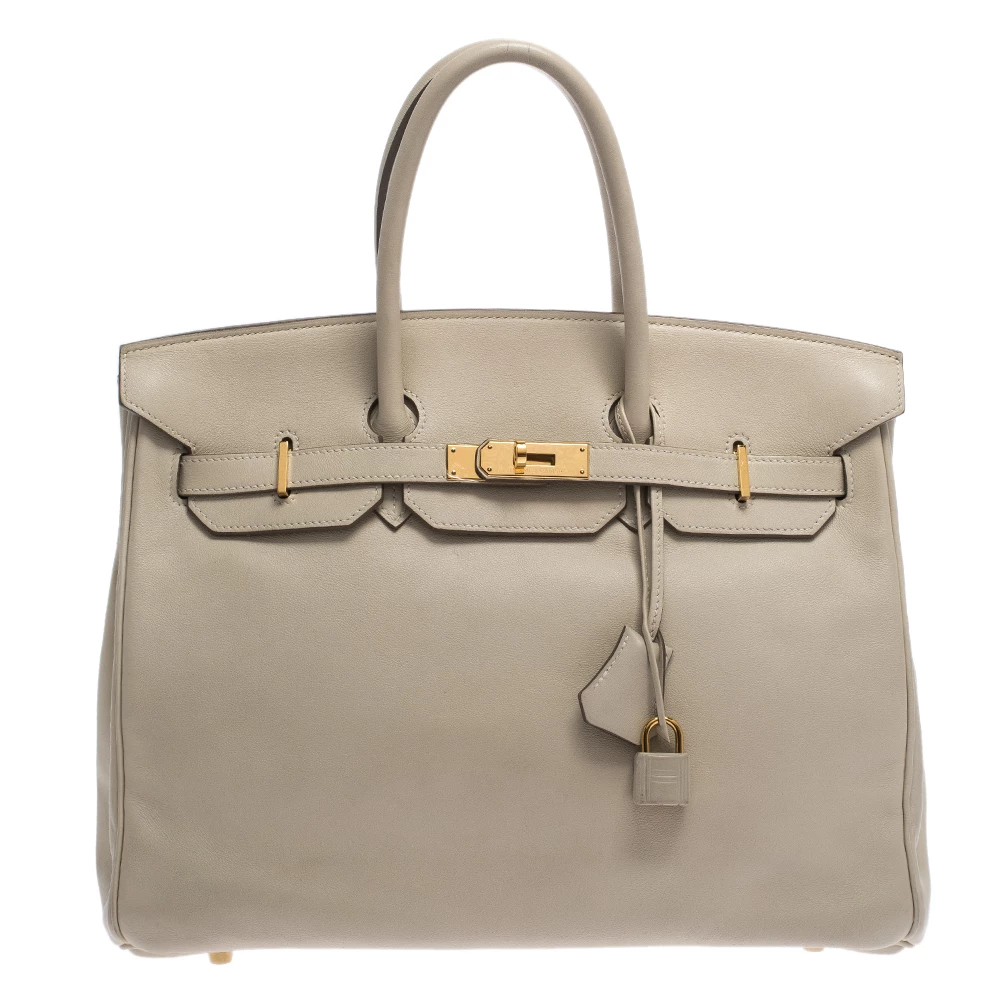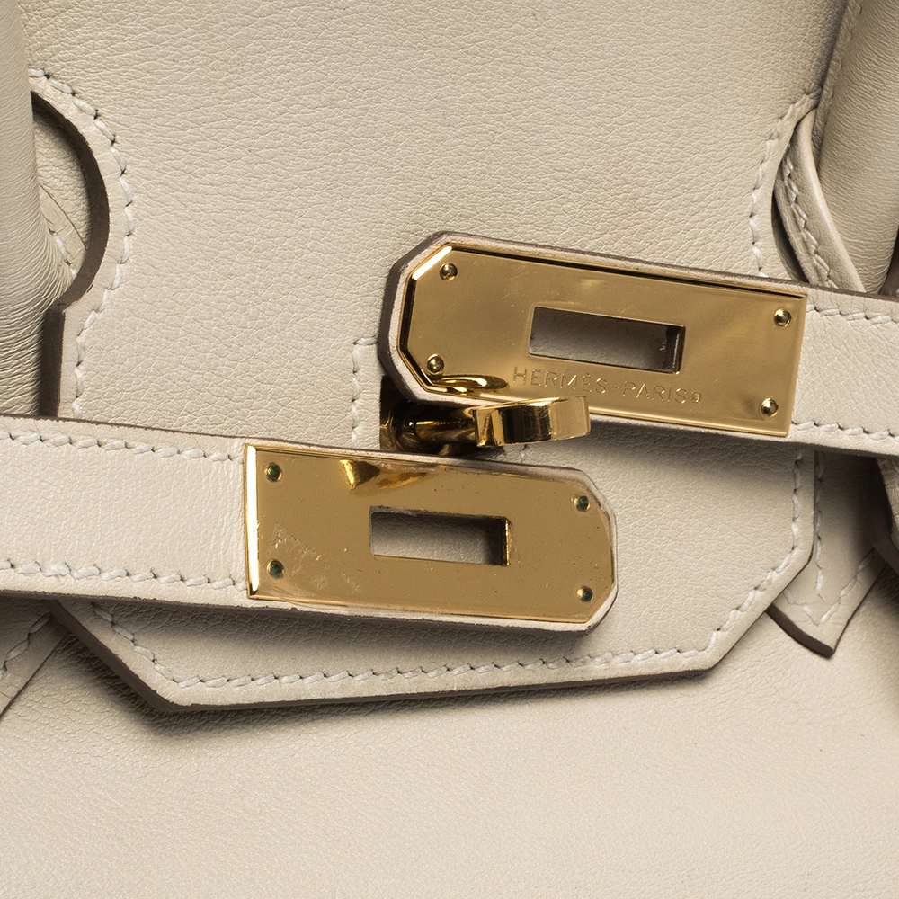 A bag that has become a hallmark of luxury and class, the Birkin from Hermes is one of the most coveted bags in the world. Custom-made on the suggestions of Jane Birkin, hence the namesake, this bag is aimed to fit the wants of the fast-paced life of modern women. Timeless design coupled with rich craftsmanship, the body of this Birkin 35 bag is crafted from white leather. Its foldover top is secured by gold-tone turn-lock closure, accompanied by a dangling lock and key which is safe within a leather clochette. The interior of the bag has a leather lining and is equipped with a pocket for storing little essentials. Complete with dual-rolled handles and studs at the bottom, this bag is an investment that will last you for years.