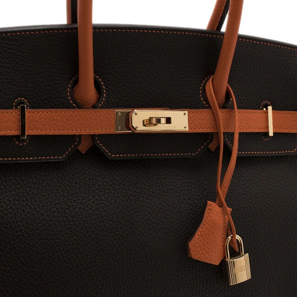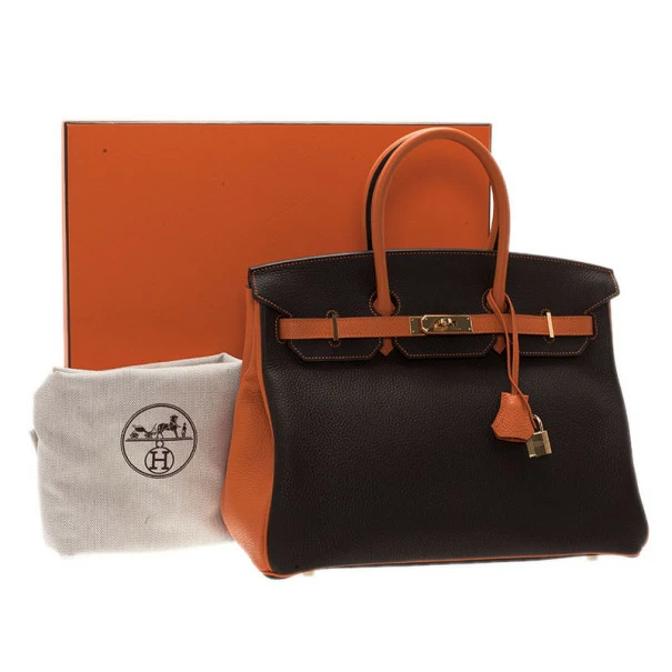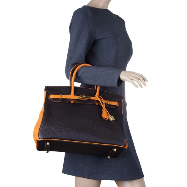 This Hermes masterpiece is like no other. A made to order custom Birkin, this bag is crafted from soft Togo leather in brown, classically combined with bright orange leather. It has gold-tone hardware on the signature Cadena twist lock and is completed with double top leather handles with a key, padlock, and a clochette. Its spacious interior is lined with matching orange leather and features a single zip pocket and two patch pockets.