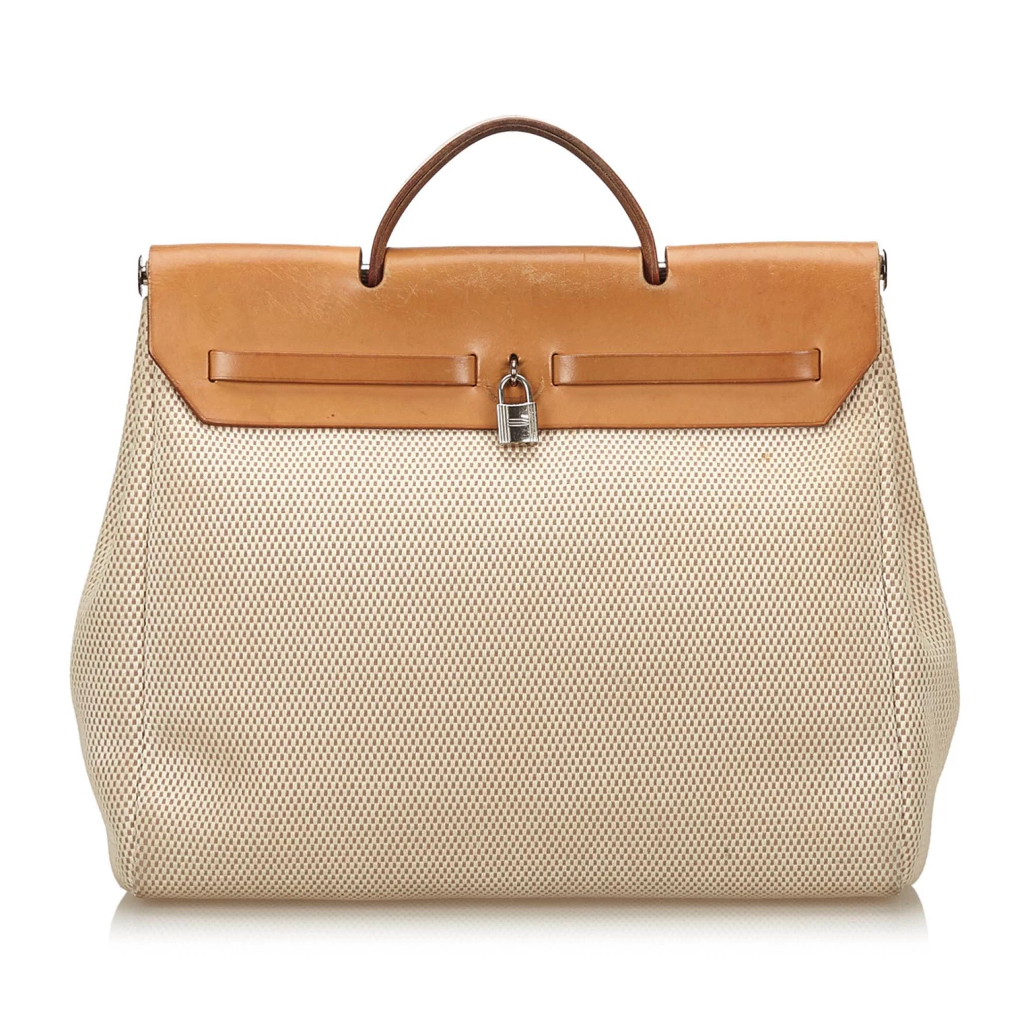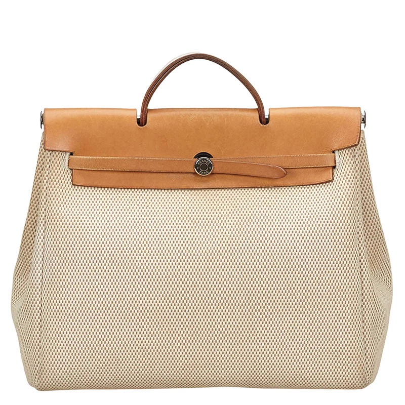 With a large and spacious interior that can hold all that you need for the day, this Hermes 2-in-1 Herbag MM bag is a perfect everyday essential piece. Crafted in ivory canvas fabric, this beautiful and elegant bag features brown leather accents and a silver tone brand name engraved button closure at the front.