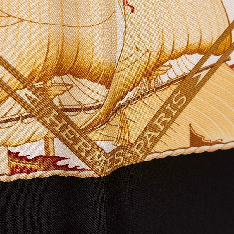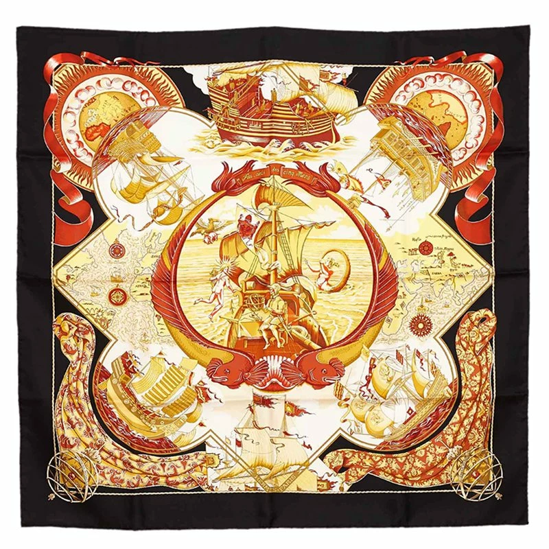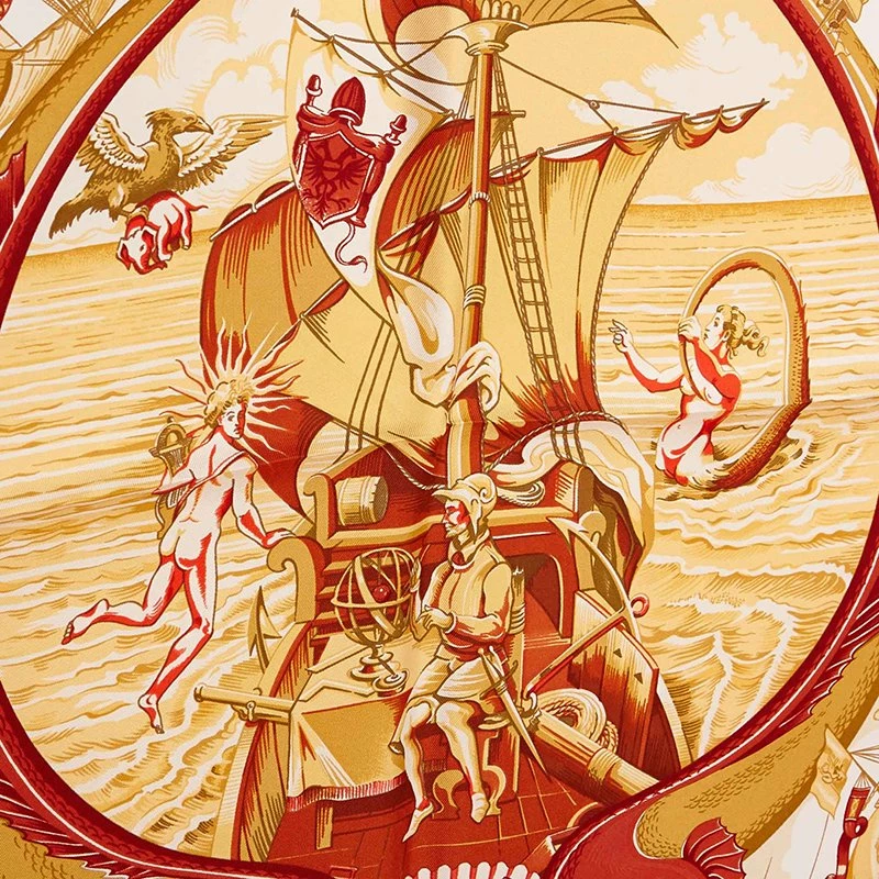 Translated to ‘Beyond the five seas’ this Hermes scarf is designed by Laurence Toutsy Bourthoumieux. It is crafted in silk.