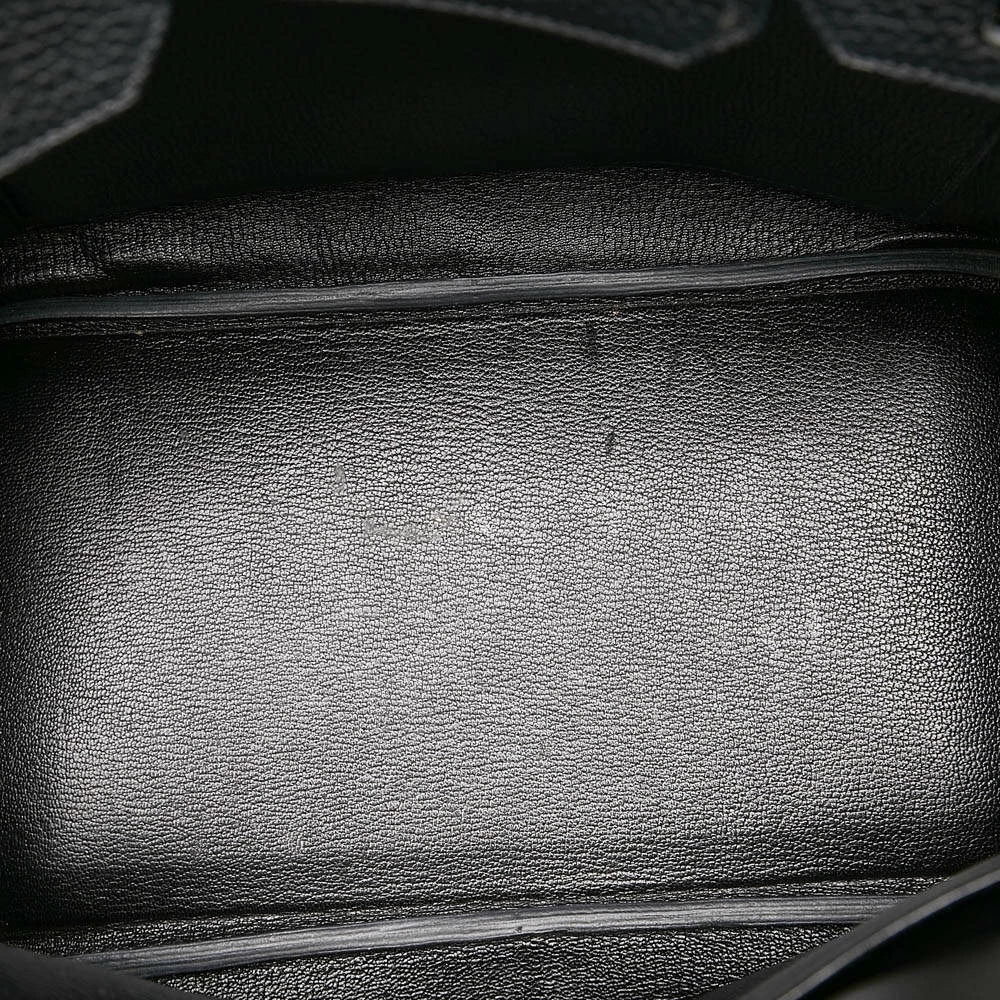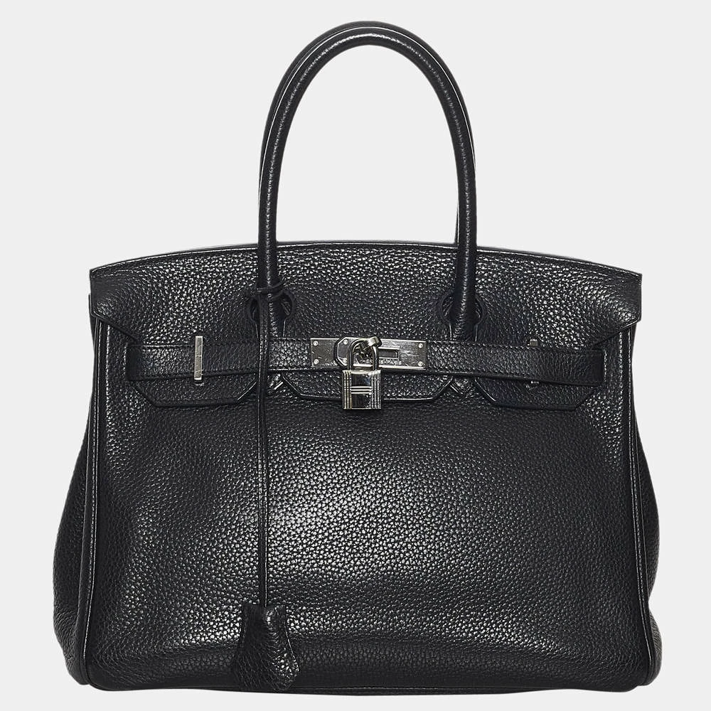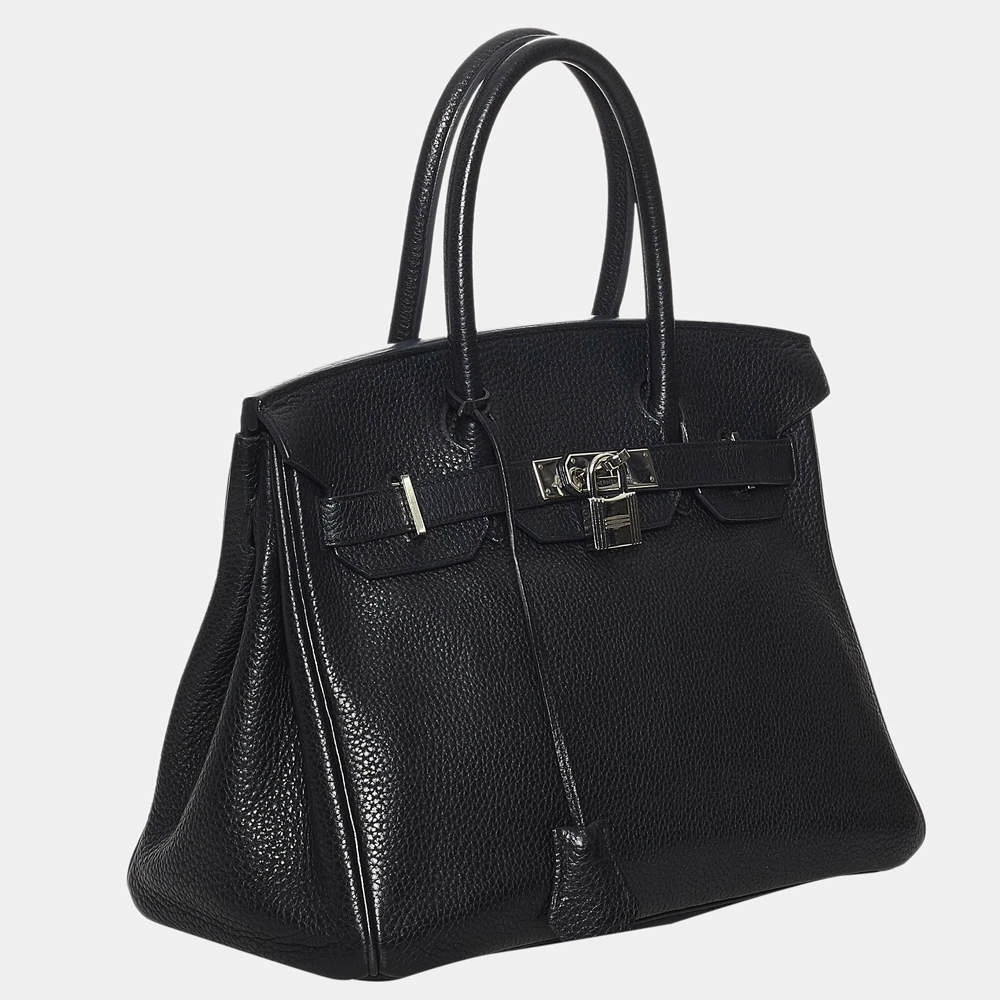 The Birkin 30 features a leather body, rolled leather handles, a front flap with a metal lock closure, and interior zip and slip pockets.
