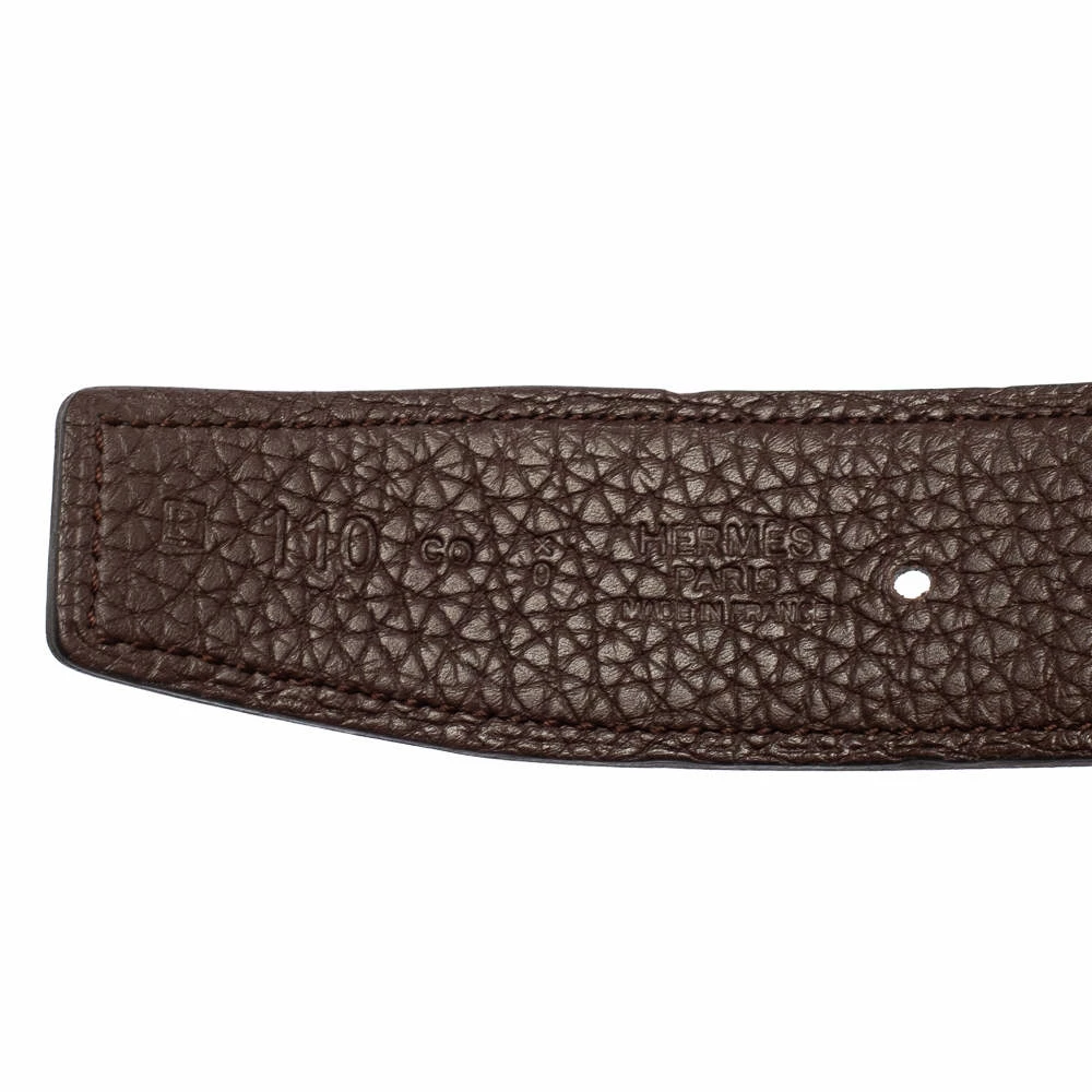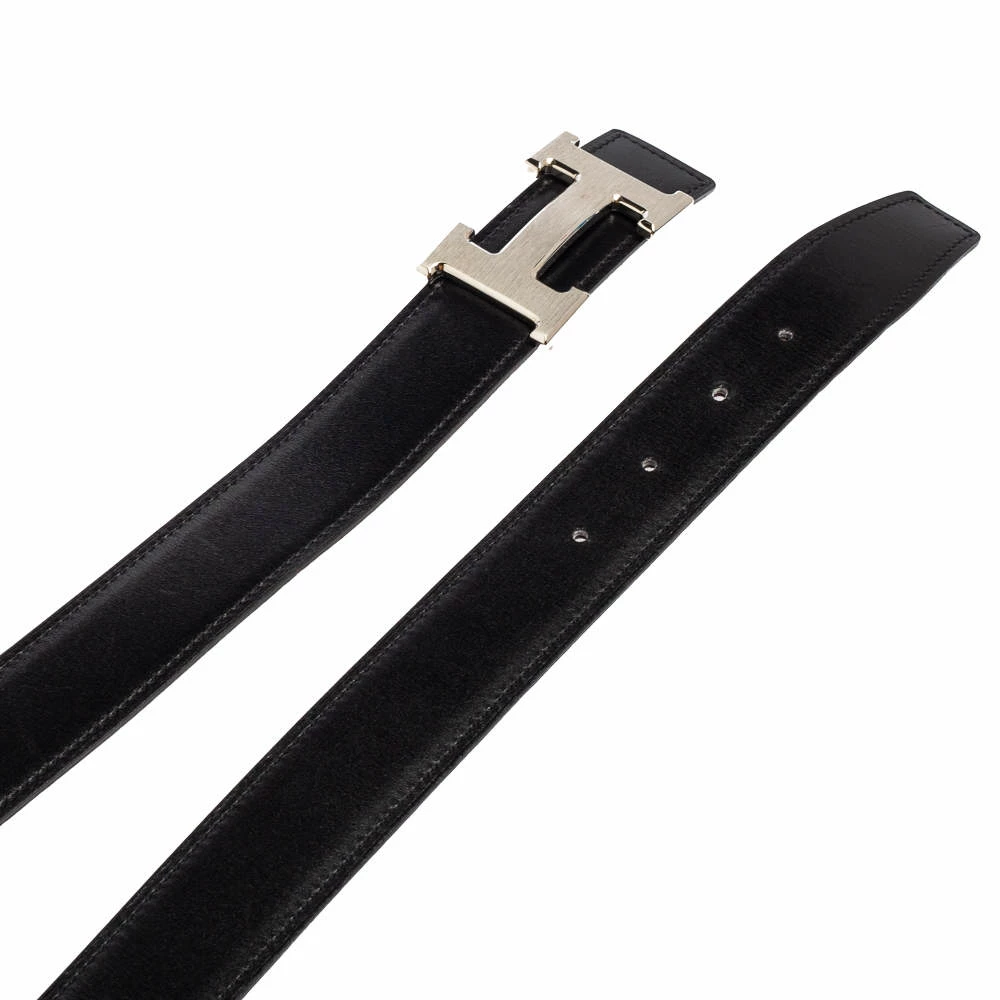 A celebrated design from the range of accessories by Hermès is the reversible belt. Here, we have the belt made from leather with a brown hue on one side and black on the other. It is finished with a silver-tone H buckle.