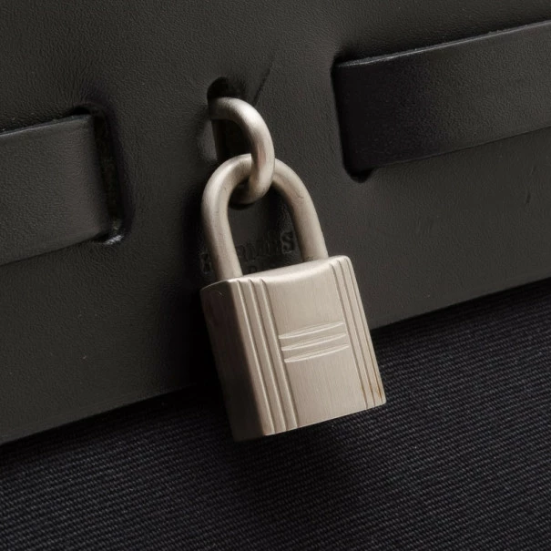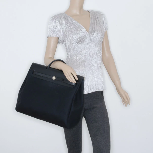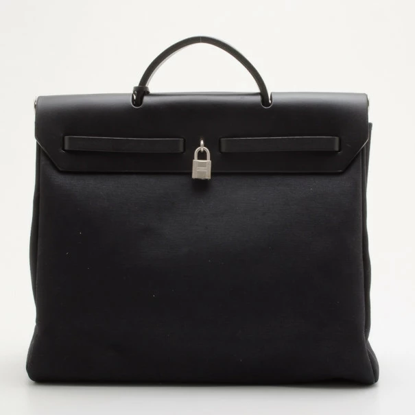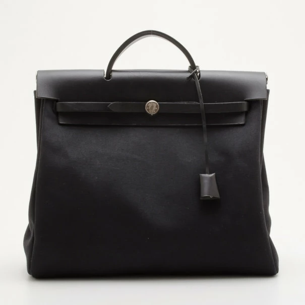 This large and stylish Black Canvas Convertible Herbag Satchel by Hermes is the ideal companion on a busy day out. This large bag is crafted from black toile canvas and smooth black leather. The look is completed with flap front closure, Hermes’s signature clochette, silver padlock and keys, and a single leather top handle. Its roomy open interior is unlined and will hold all of your daily necessities comfortably!Condition: Gently Used (Signs of use on hardware. Overall this bag is in good condition)Dimensions: 33 CM(H) 43 CM(W)Handle Drop: 6 CM (Distance between handle and top of the bag)Material: Toile Canvas and Leather Exterior, Toile Canvas InteriorHardware: Silver-toneIncludes: Original Dustbag