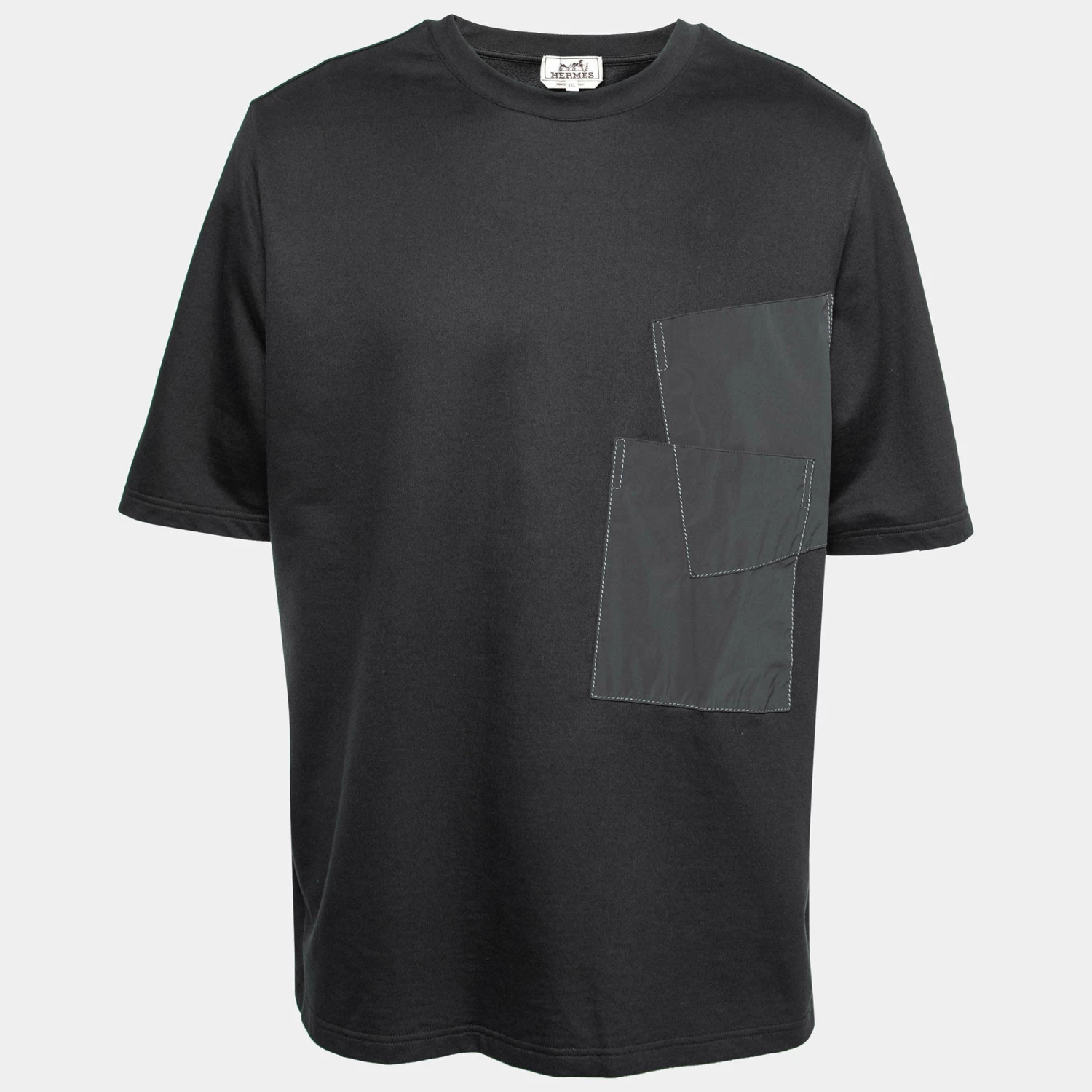 This T-shirt from the House of Hermes is here to make you look fashionable. It is tailored using black cotton fabric and displays short sleeves, a crew neck, and an asymmetrical pocket. Wear this Hermes T-shirt with pants or denim for casual outings.