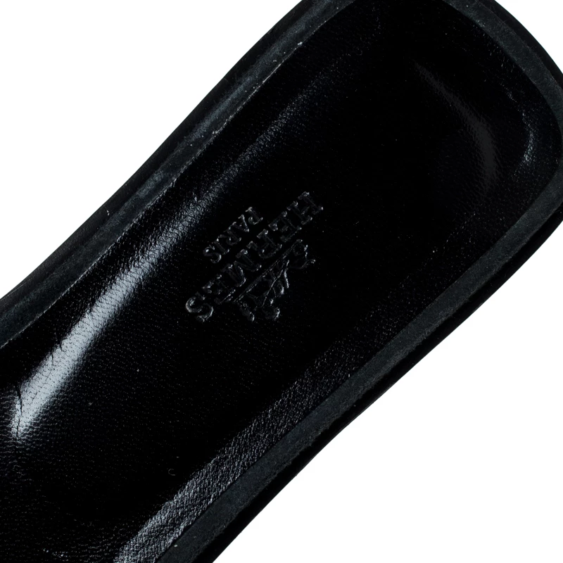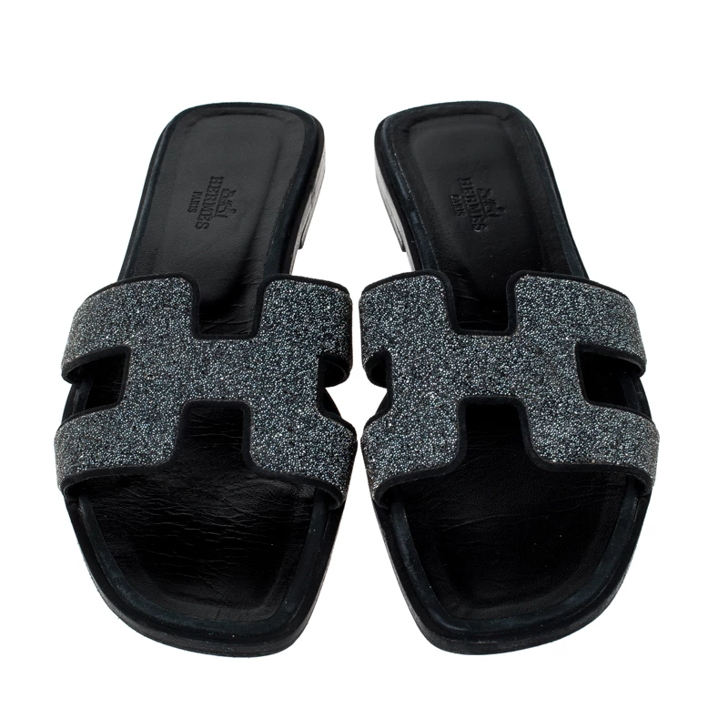 Stunning in appeal and high on style, these Oran sandals are sure to gaze many eyes your way. Crafted from suede and embellished with crystals, this Hermes pair comes with a comfortable leather sole. This pair looks extremely beautiful in a timeless black shade. So, put your best foot forward this season in these pretty sandals.
