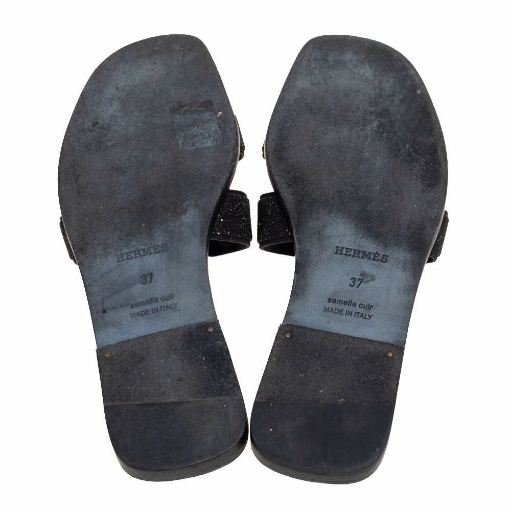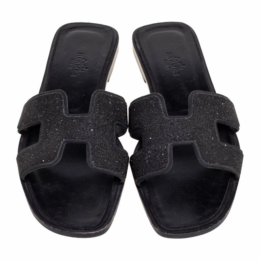 Put your best foot forward this season in these pretty Hermes sandals. These black Oran sandals have been crafted from crystal suede in Italy and they feature the iconic H on the vamps as well as insoles meant to provide comfort at every step. These sandals are sure to attract admirers!