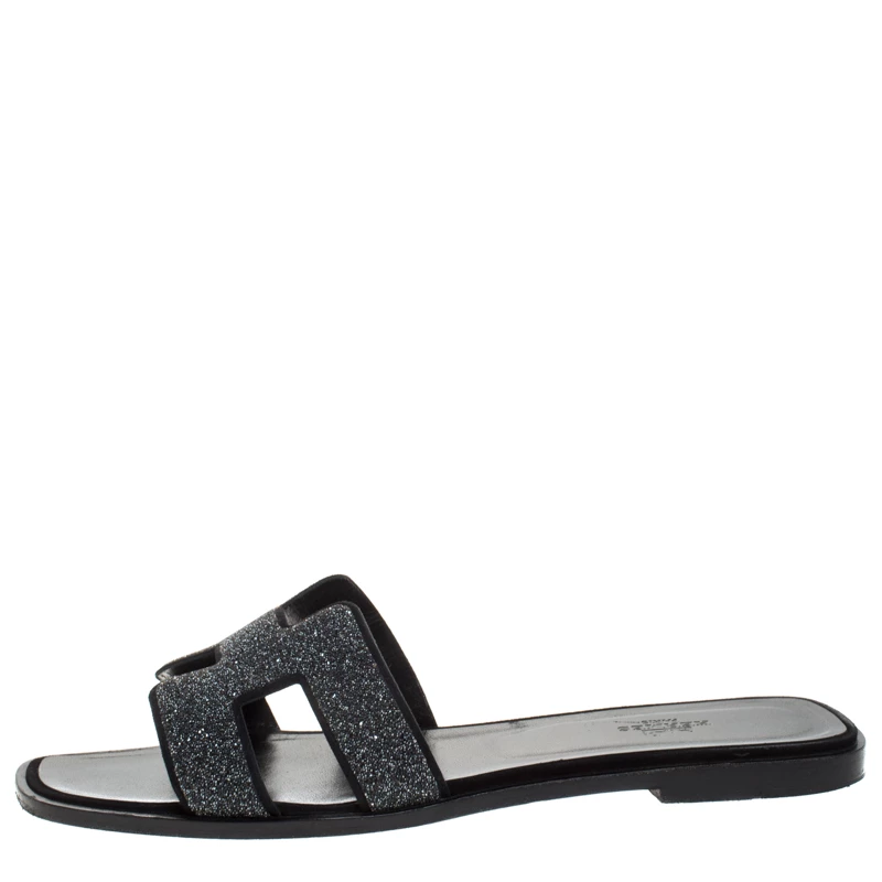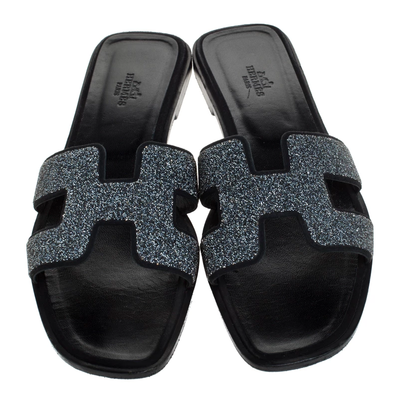 Put your best foot forward this season in these pretty Hermes sandals. These black Oran sandals have been crafted from crystal suede in Italy and they feature the iconic H on the vamps as well as insoles meant to provide comfort at every step. These sandals are sure to attract admirers