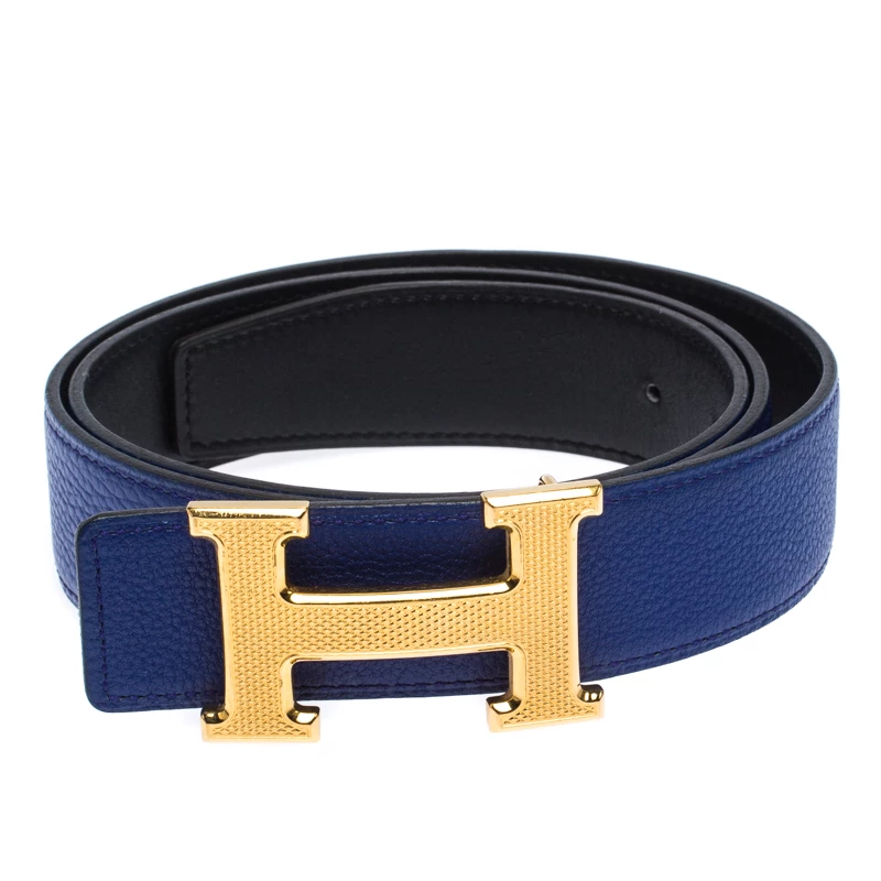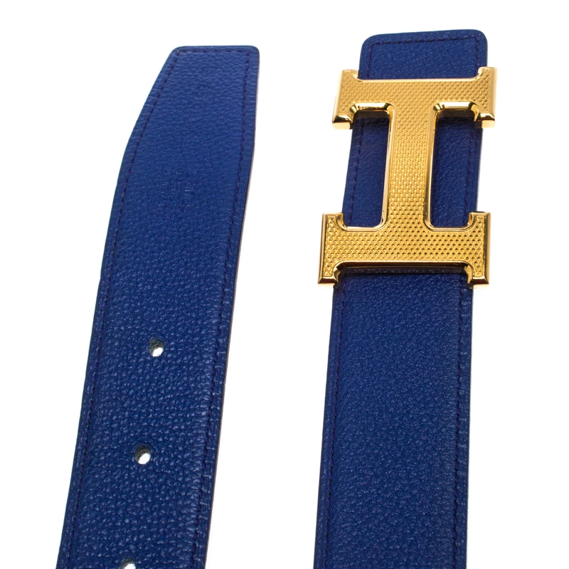 A classic add-on to your collection of belts, this Hermes piece has been crafted from Swift and Epsom leather. It is reversible with a black shade on one side and electric blue on the other. It is topped with an H buckle in gold-tone. This wardrobe essential piece will complement your style.