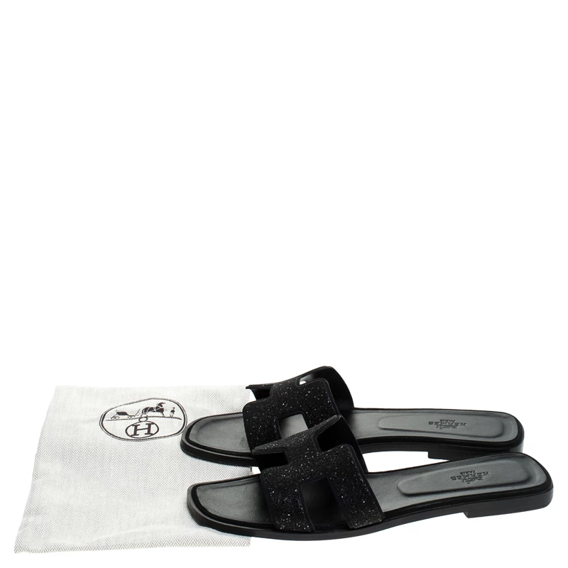 Put your best foot forward this season in these pretty Hermes sandals. These black Oran sandals have been crafted from glitter leather in Italy and they feature the iconic H on the vamps as well as insoles meant to provide comfort at every step. These sandals are sure to attract admirers!