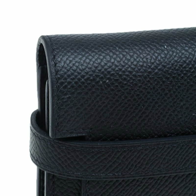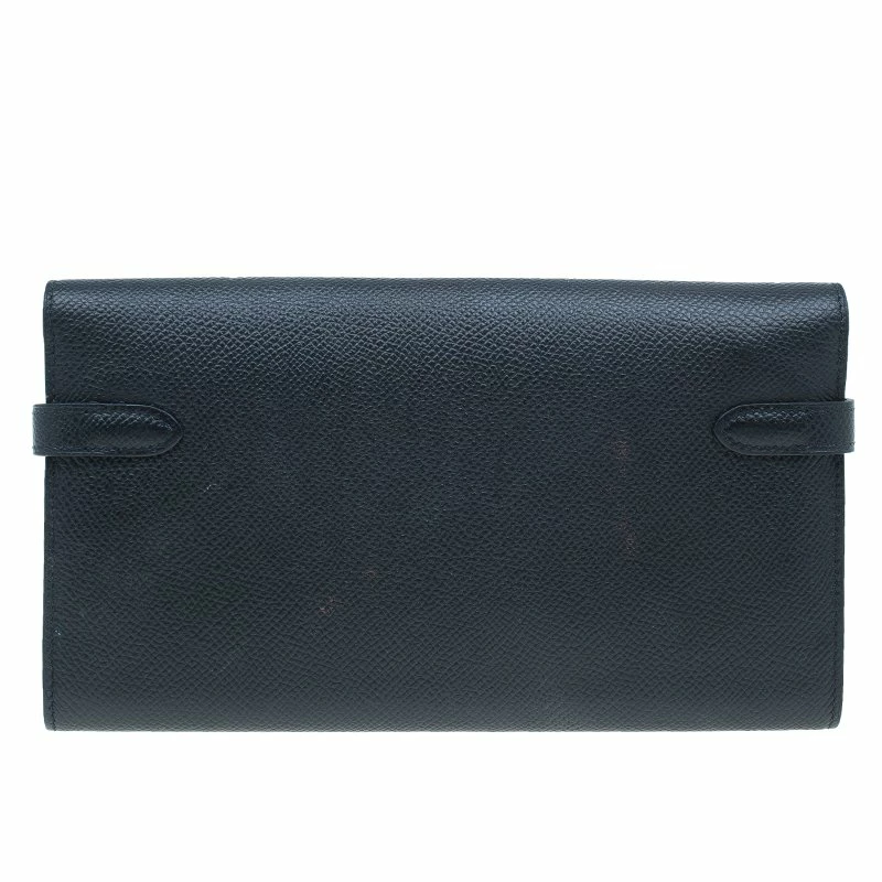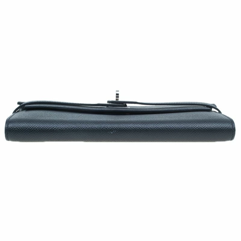 Add to your collection this black wallet from Hermes. Its a classic piece from Hermes and is a must have!! Crafted from black leather, it features iconic Hermes Kelly turn-lock closure in silver-tone hardware. The leather lined interior houses one zipped compartment, two side pockets and twelve card slots.