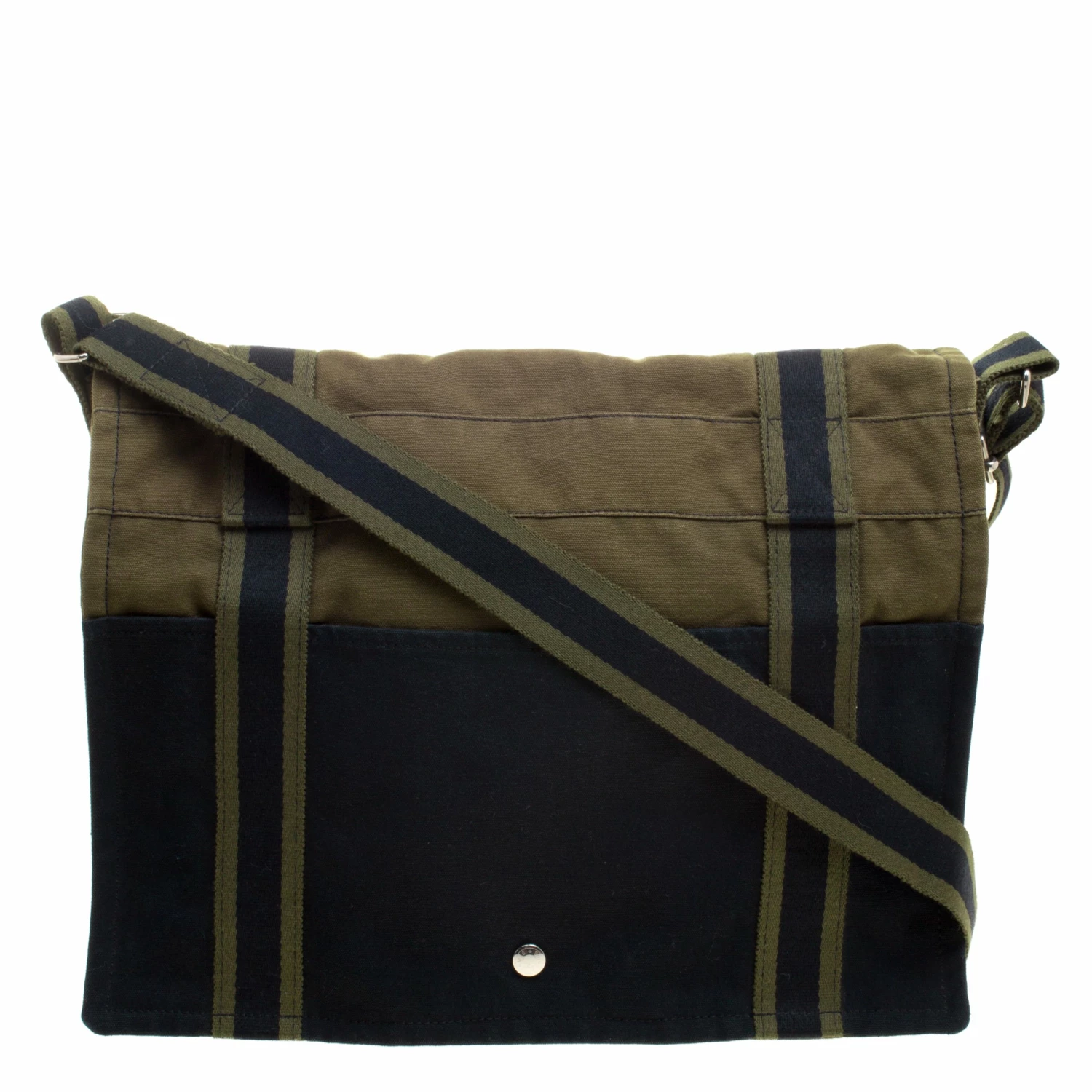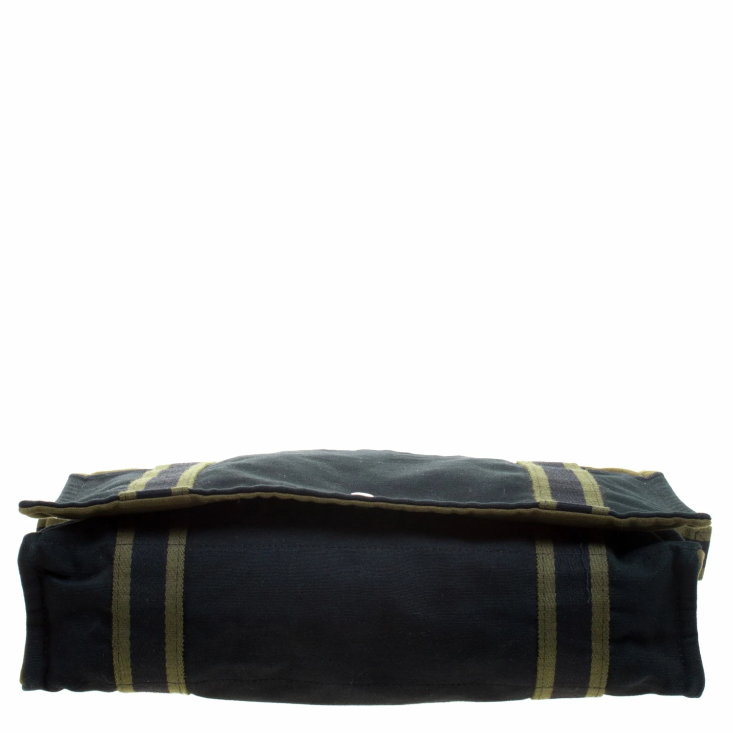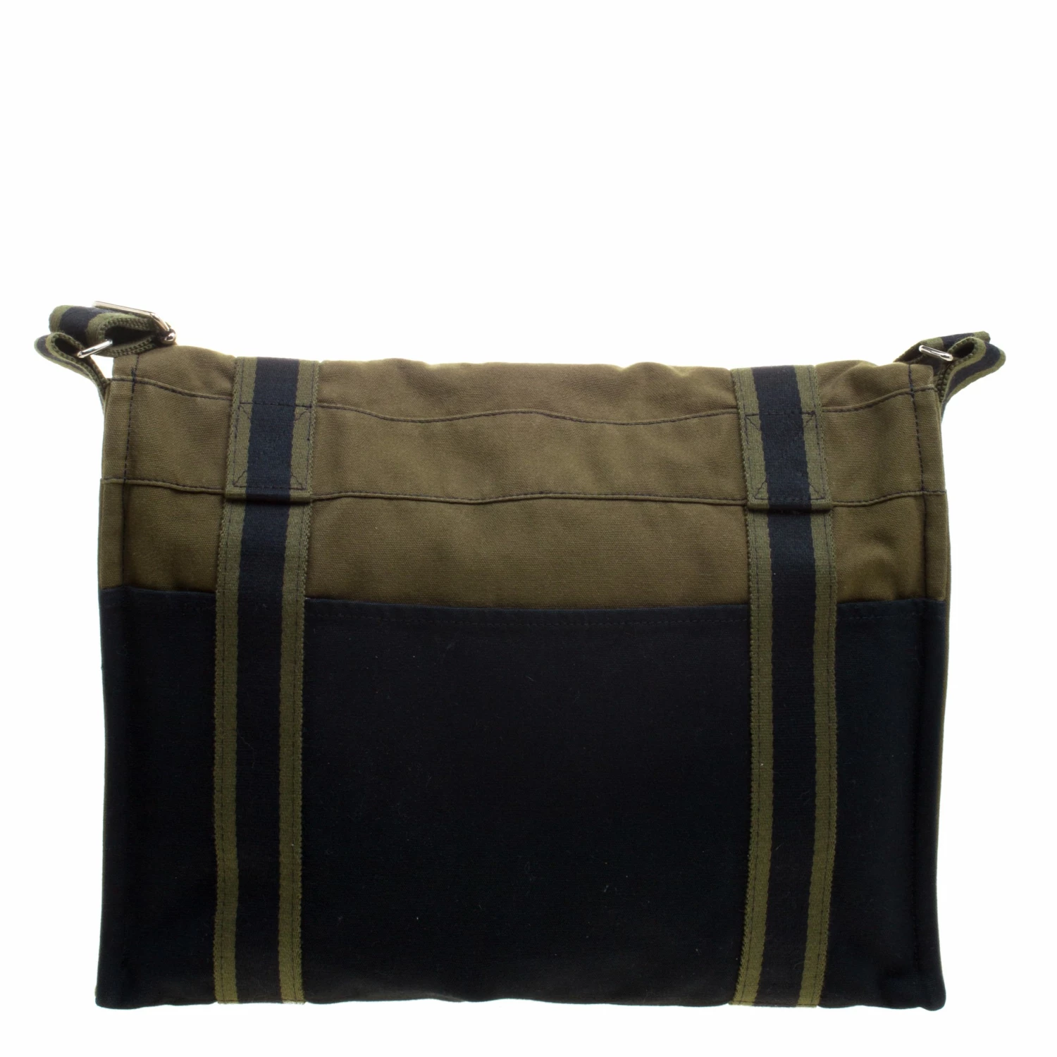 Smart and functional, this Fourre Tout Messenger bag from Hermes is a must have. It has been made from black/green canvas and is equipped with a shoulder strap. The front flap button closure opens to a spacious canvas lined interior that houses a zip pocket.