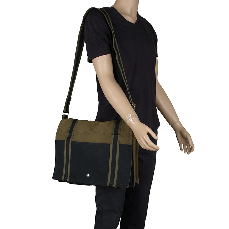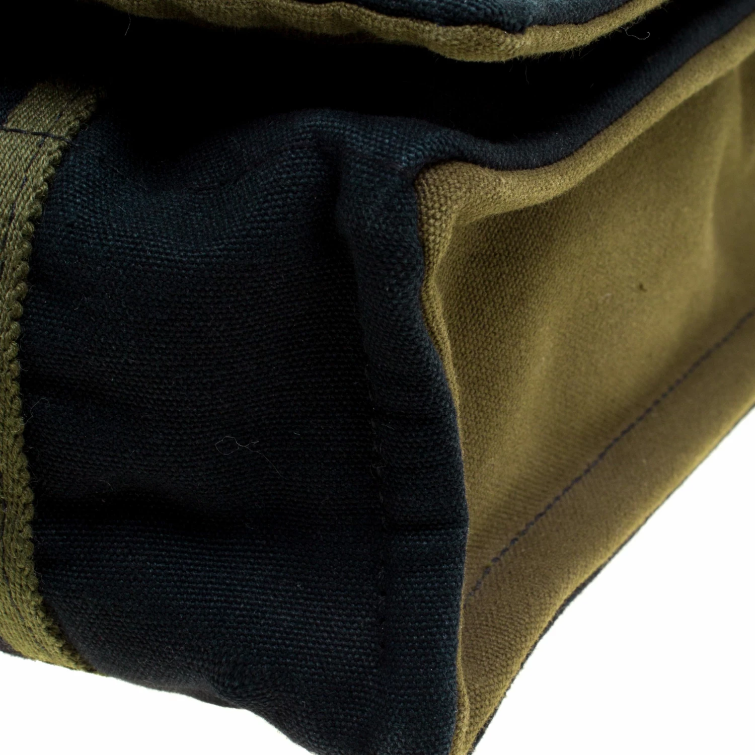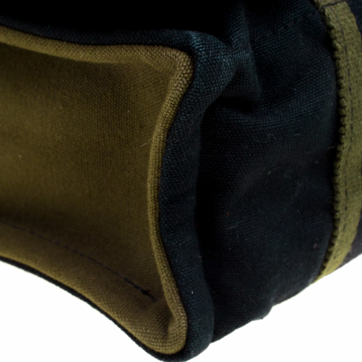 Smart and functional, this Fourre Tout Messenger bag from Hermes is a must have. It has been made from black/green canvas and is equipped with a shoulder strap. The front flap button closure opens to a spacious canvas lined interior that houses a zip pocket.
