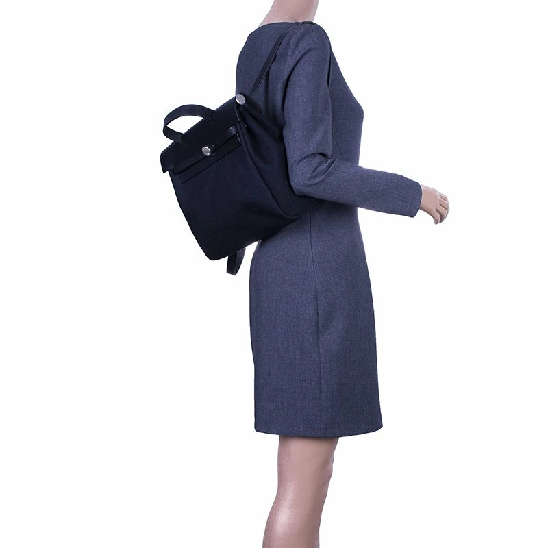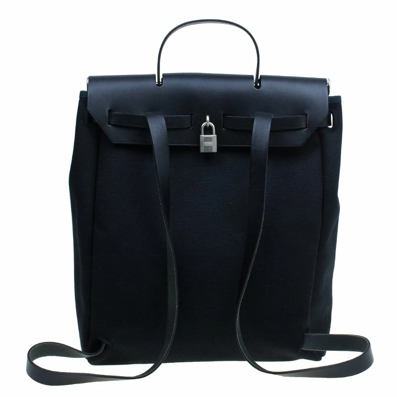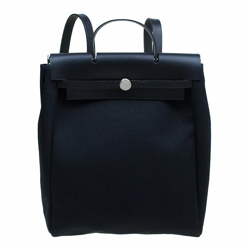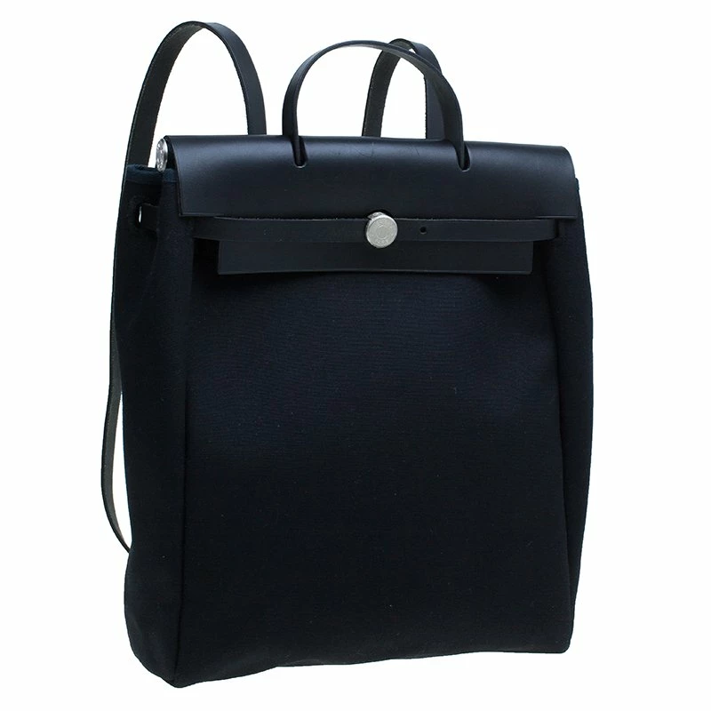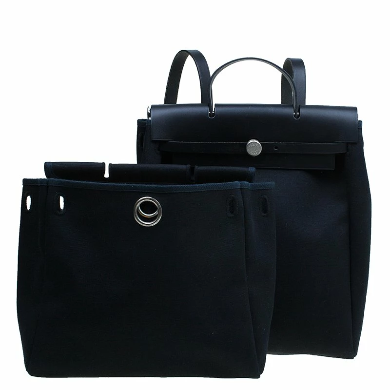 Carry this chic and functional Herbag convertible satchel by Hermes along with you everywhere. The stylish design has a smooth structured black leather top with a canvas body that can be switched up between a small and a large bag that converts this tote into a backpack. The look is completed with flap front closure, Hermes’ signature clochette, keys, top handle, and shoulder strap. Its roomy open interior is unlined and will comfortably hold all of your daily necessities!