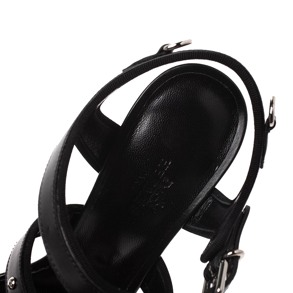 Exuding a downtown, punk vibe, these instantly recognizable sandals are from the signature Collier de Chien collection of Hermès. The sandals, made of black leather in Italy. They are adorned with the iconic Collier de Chien motif in gold-tone featuring pyramid studs and a ring. It is completed with open toes, buckled ankle straps, 10.5 cm heels and durable leather soles.