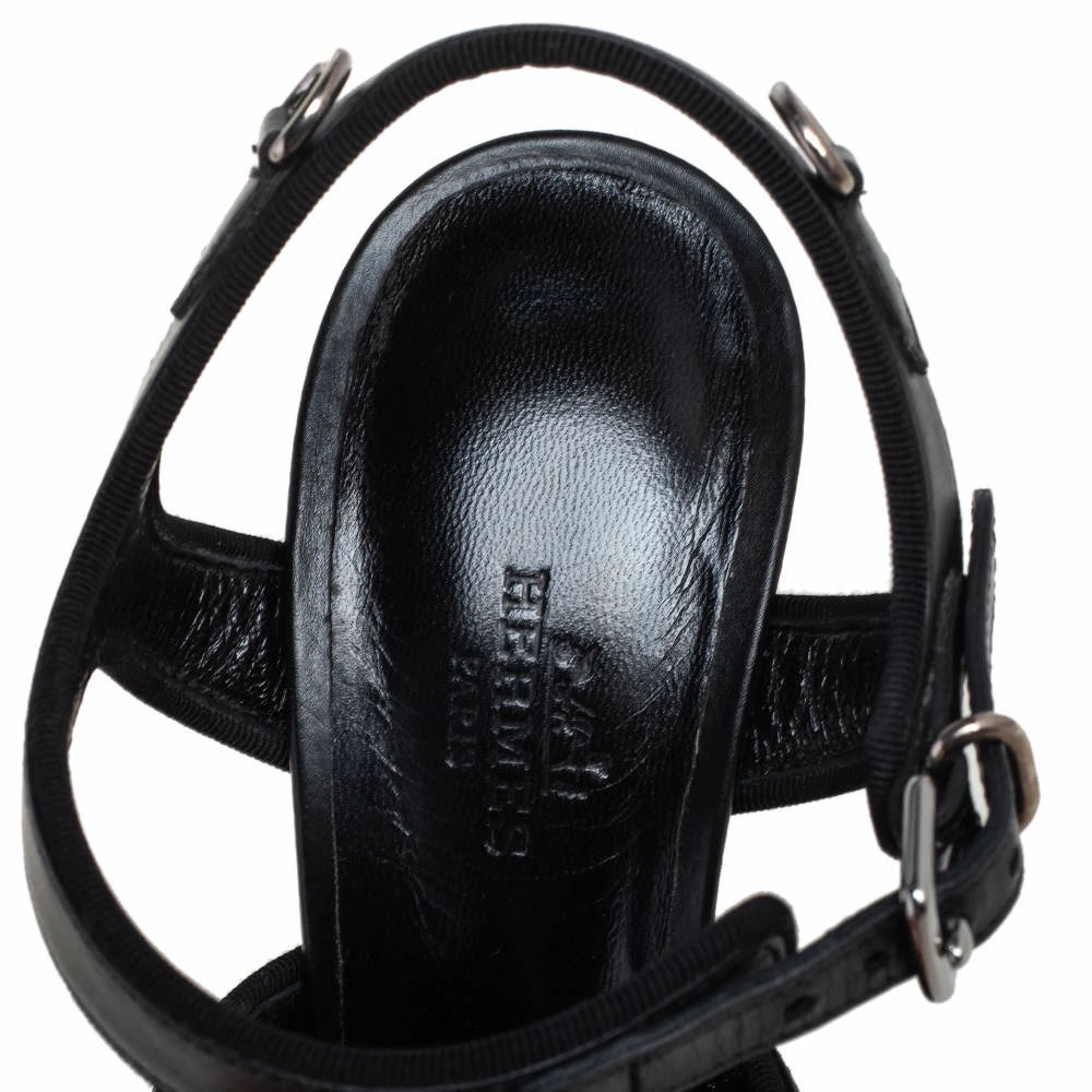 Exuding a downtown, punk vibe, these instantly recognizable sandals are from the signature Collier de Chien collection of Hermès. The sandals, made of black leather in Italy. They are adorned with the iconic Collier de Chien motif in silver-tone featuring pyramid studs and a ring. It is completed with open toes, buckled ankle straps, 10.5 cm heels, and durable leather soles.