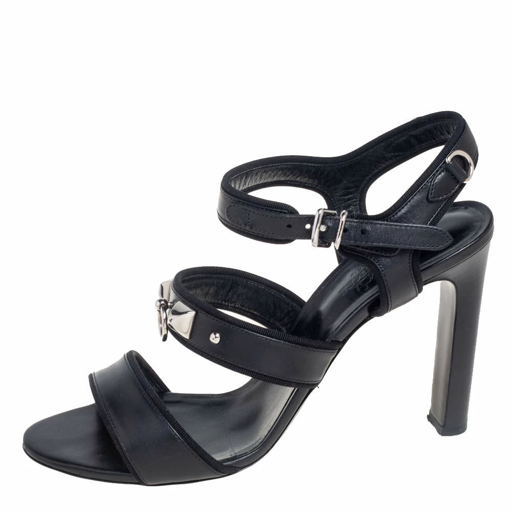 Exuding a downtown, punk vibe, these instantly recognizable sandals are from the signature Collier de Chien collection of Hermès. The sandals, made of black leather in Italy. They are adorned with the iconic Collier de Chien motif in silver-tone featuring pyramid studs and a ring. It is completed with open toes, buckled ankle straps, 10.5 cm heels, and durable leather soles.