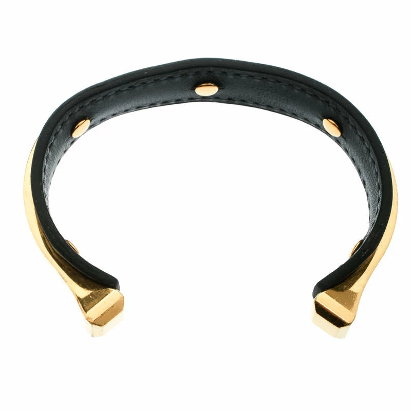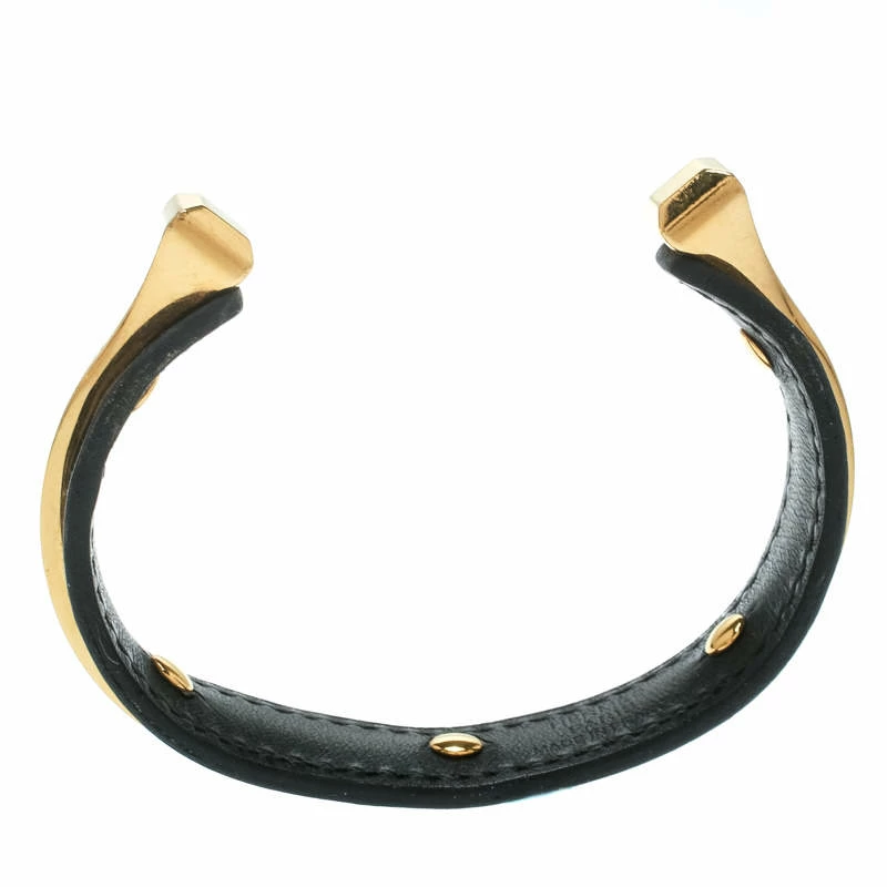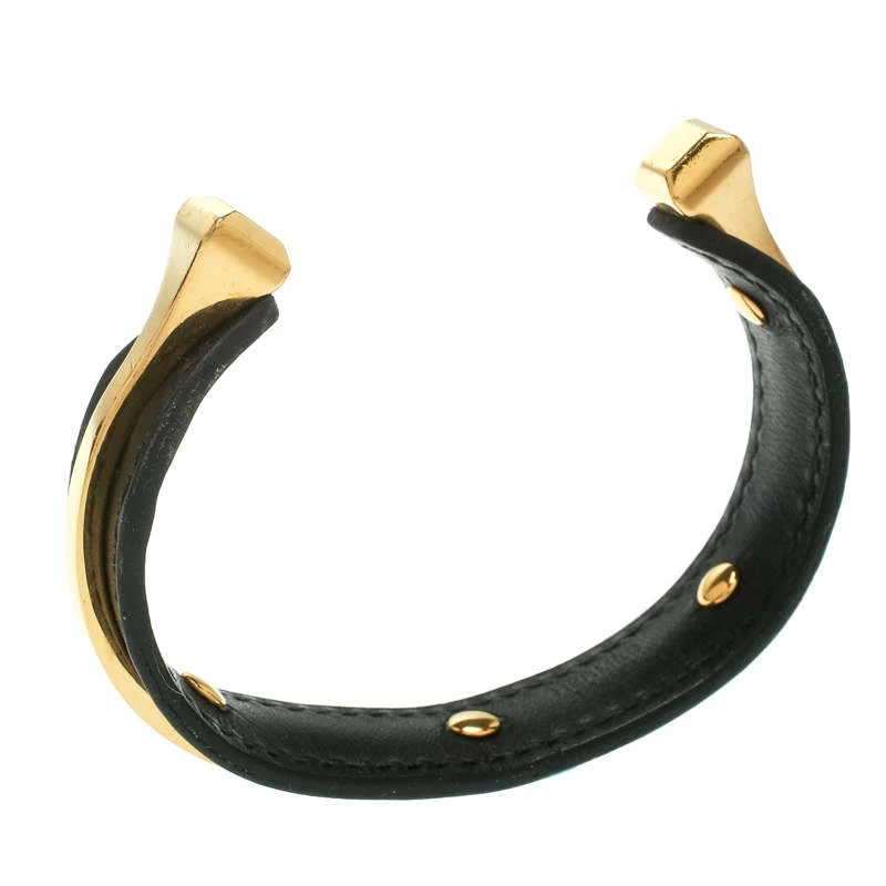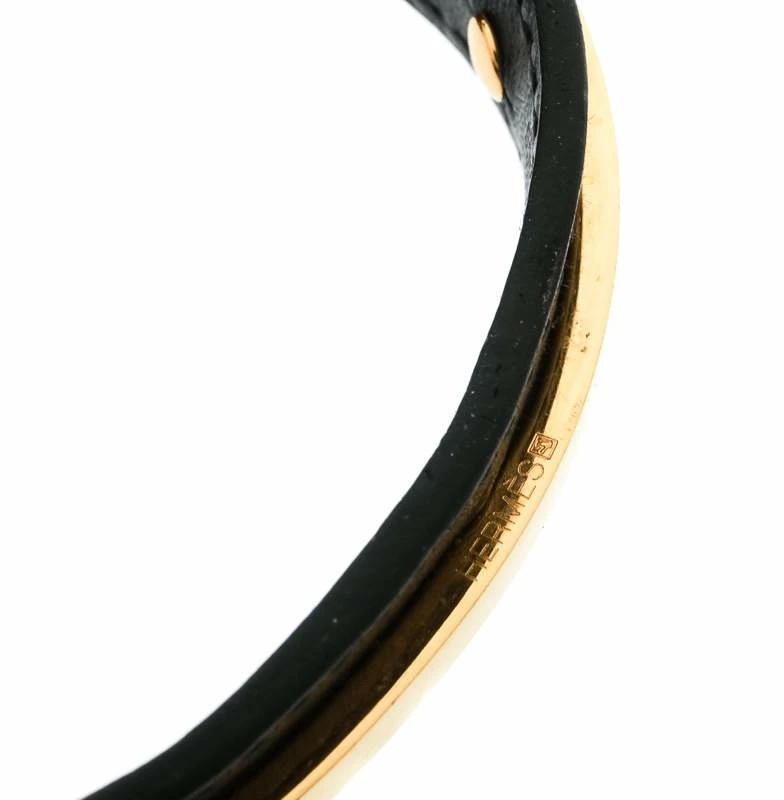 Simplicity and class combine to form this exquisite Hermes bracelet just for you. It is made from gold-tone metal and black leather in an open cuff style. It will make a fine statement accessory.