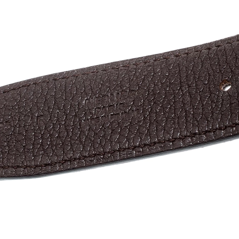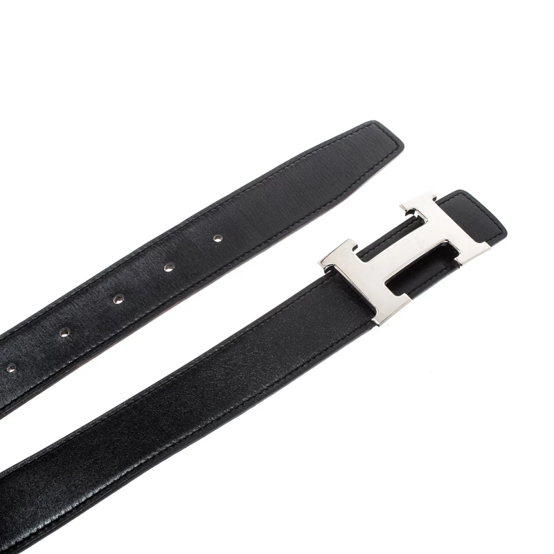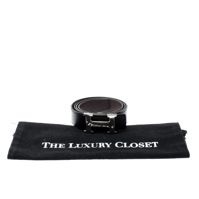 Create a statement and a luxurious look with this Hermes reversible belt. Designed in classic black leather, this belt features a bold silver-tone H metal buckle at the front which is a signature touch from the brand. Wear it both ways and create formal and even casual looks with just this one piece.