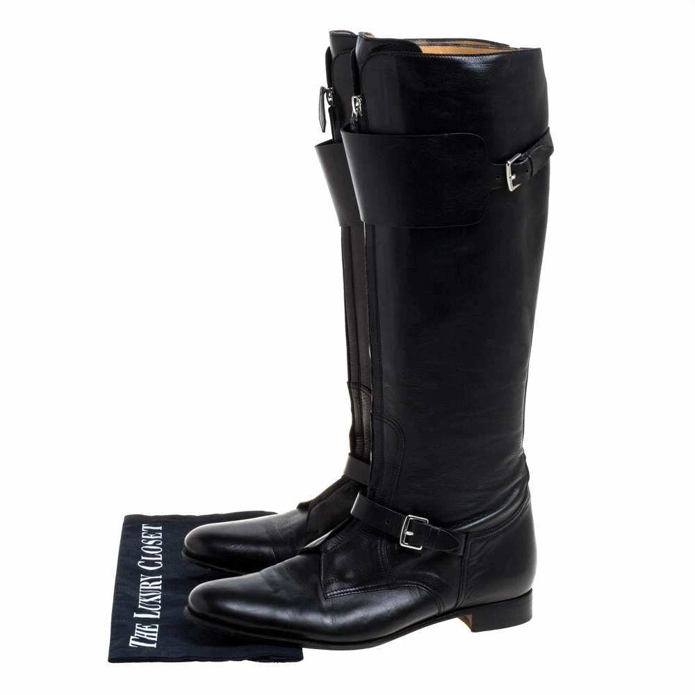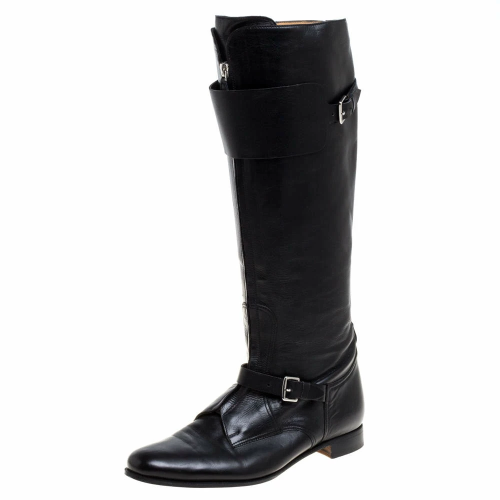 This bold yet chic pair of Hermes boots has a stylish silhouette and simple design. The knee-high boots have been crafted from black leather featuring chain detail on the front and buckled straps on the ankles and at the top. Representing the power dressing of modern women, these beauties are complete with round toes and minimal heels. We like them with skinny jeans and leather jackets.