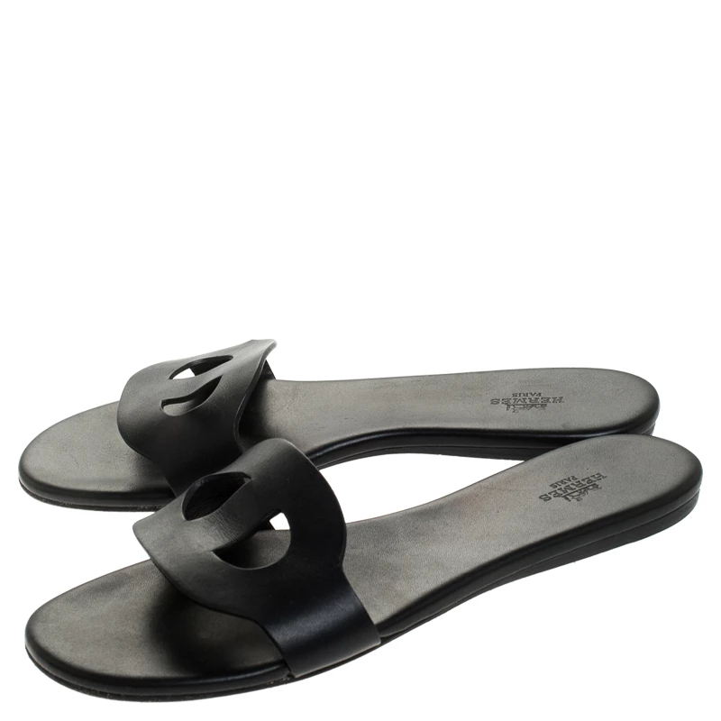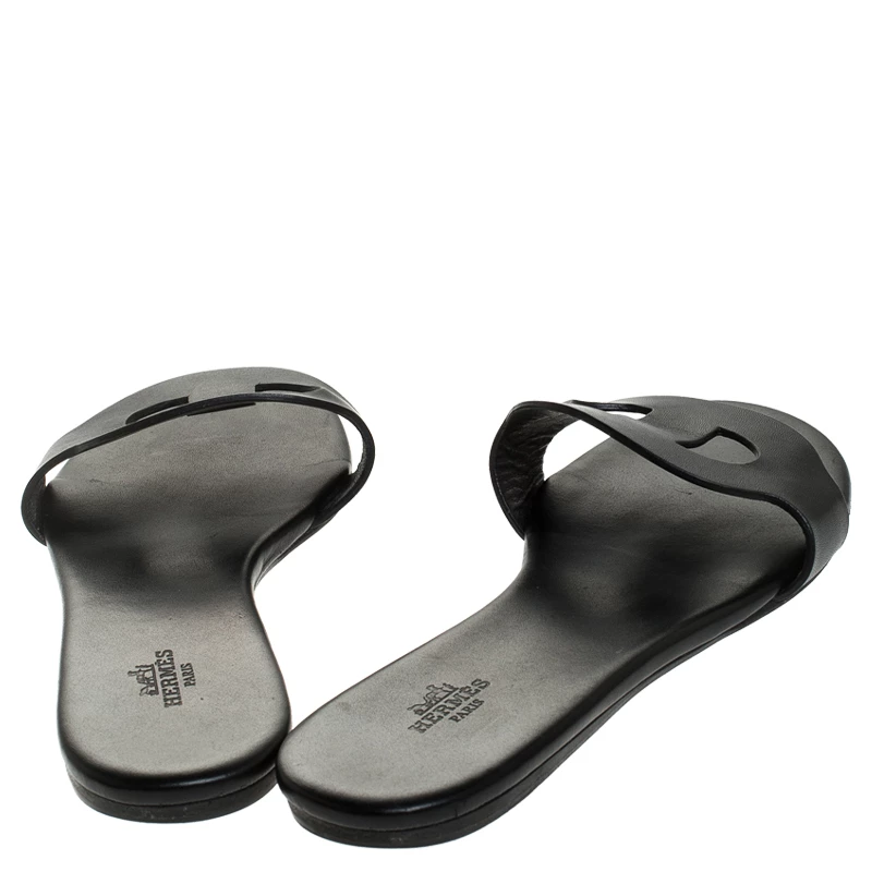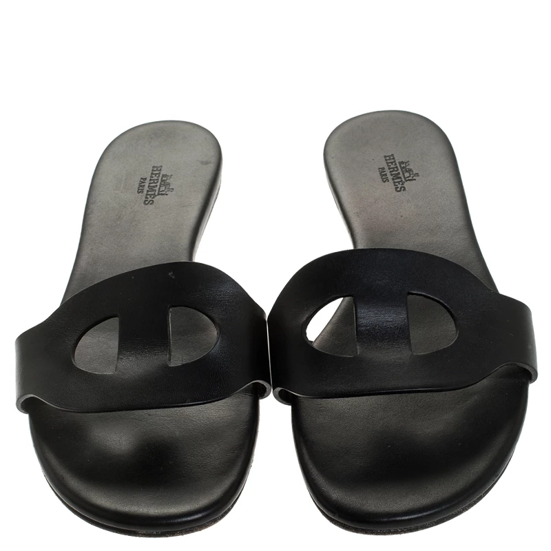 The perfect summer footwear, these Lisboa slides from Hermes will give a relaxed touch to your looks. Crafted from supple black leather, they come with cutout straps on the front. Pick these slides to lounge in around the house, for a comfortable outing, or even poolside.
