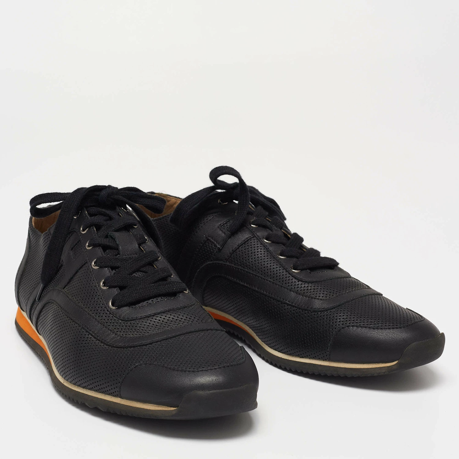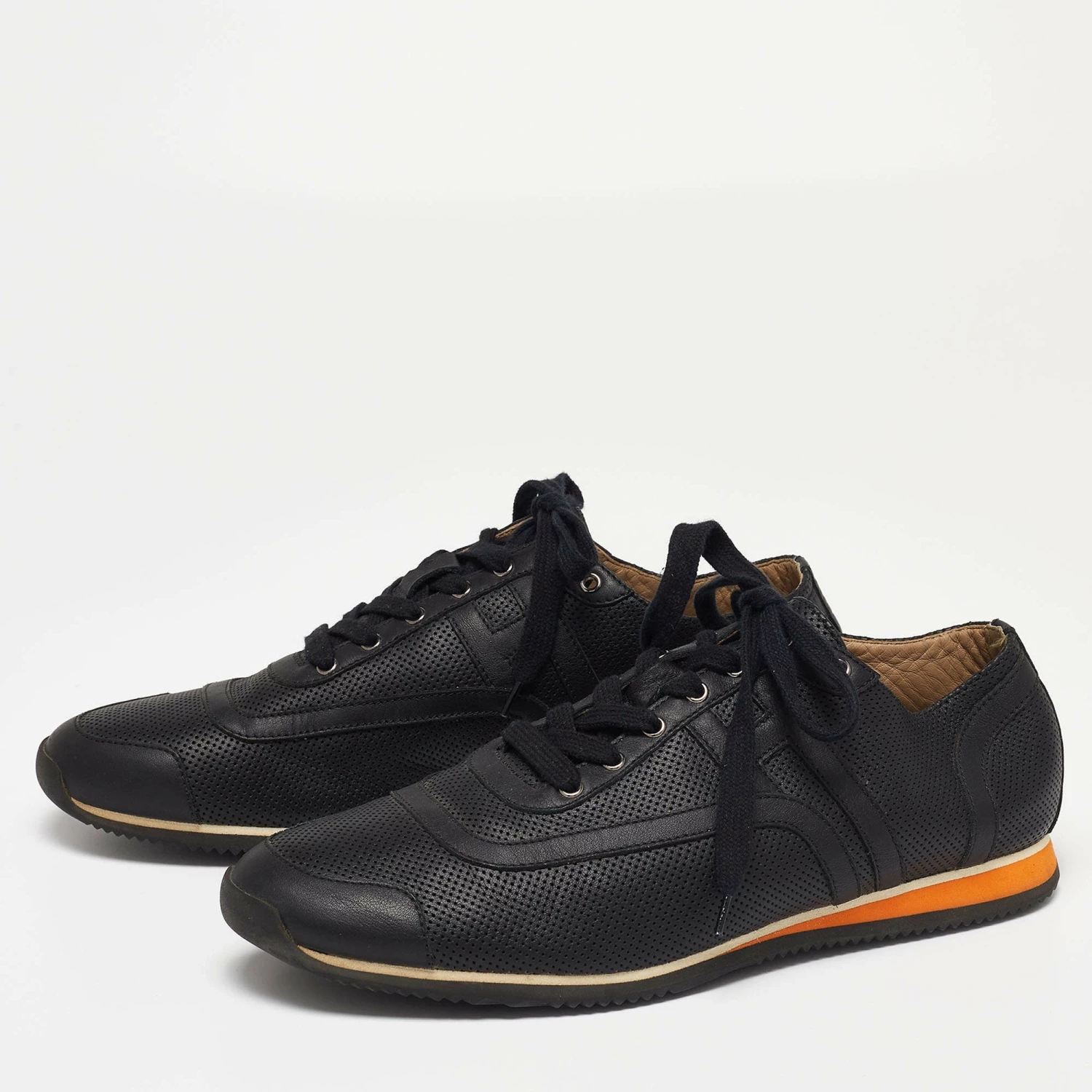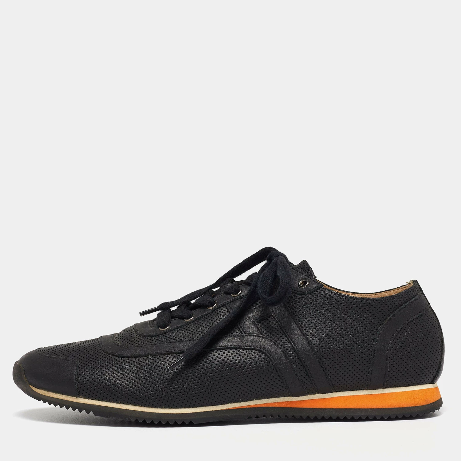 Delivered in a classic low-top silhouette, these Hermes sneakers are a seamless combination of luxury, comfort, and style. They are made from leather in a black shade and added with perforated details, laced-up vamps, and comfortable soles.