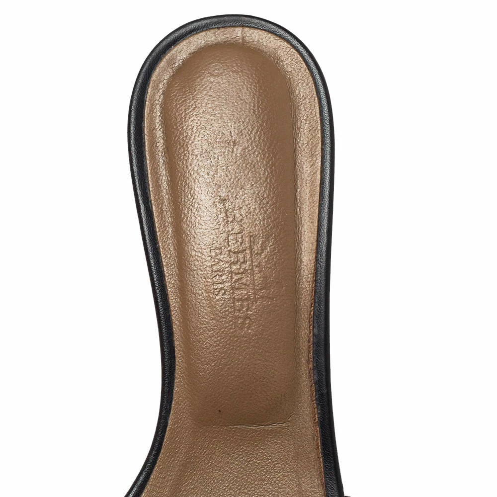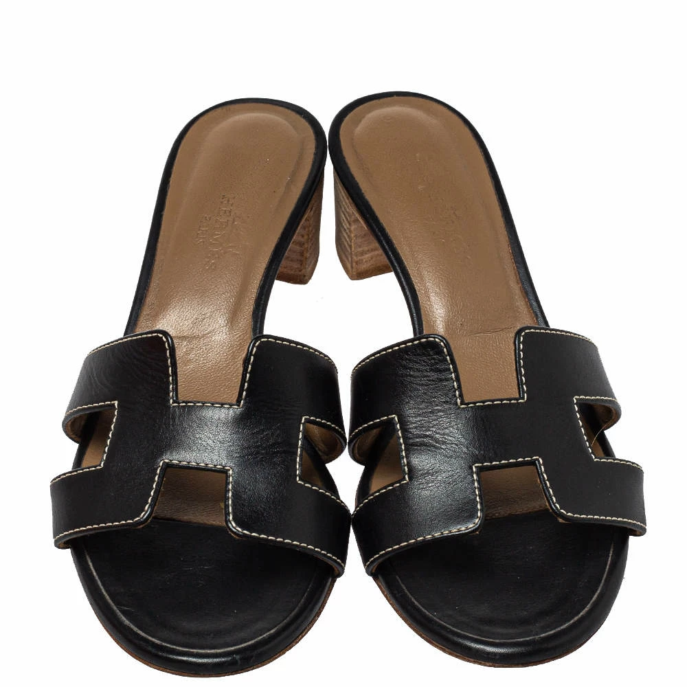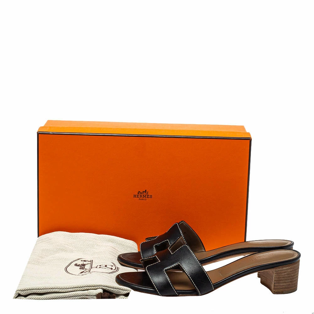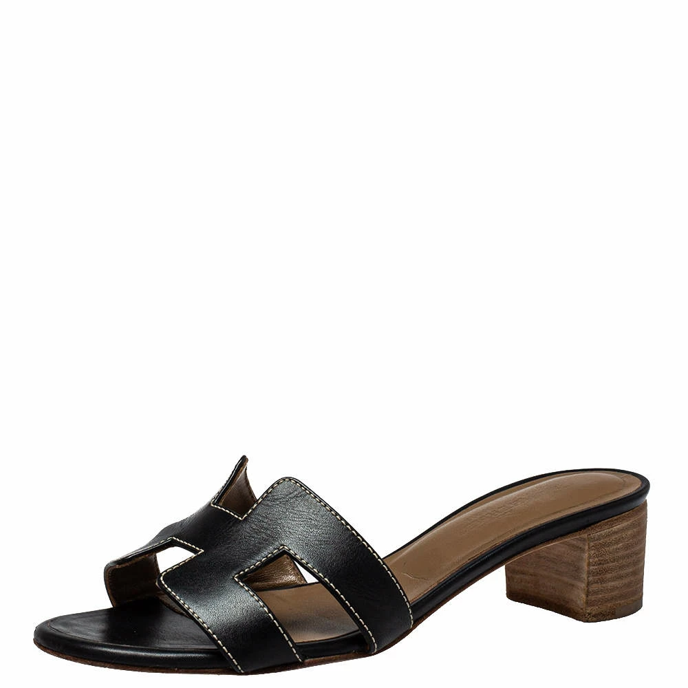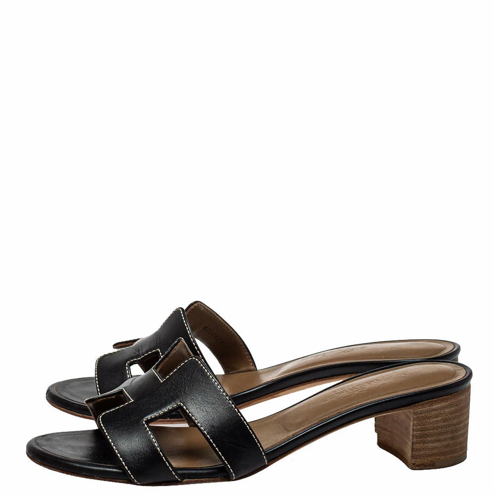 Crafted from black leather, these Oasis sandals from Hermes are classy and comfortable with their 3.5 cm block heels. These sandals feature the signature H-shaped straps on the front. The insoles are lined with leather and carry the brand label.
