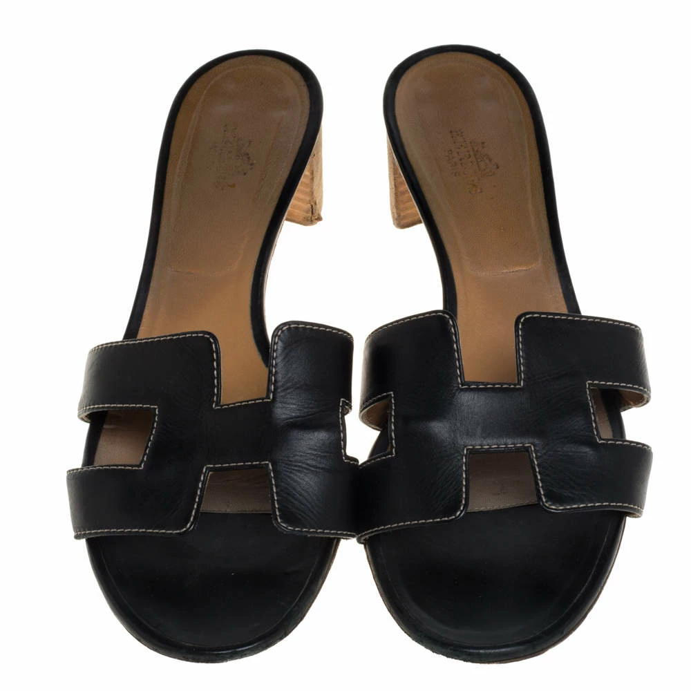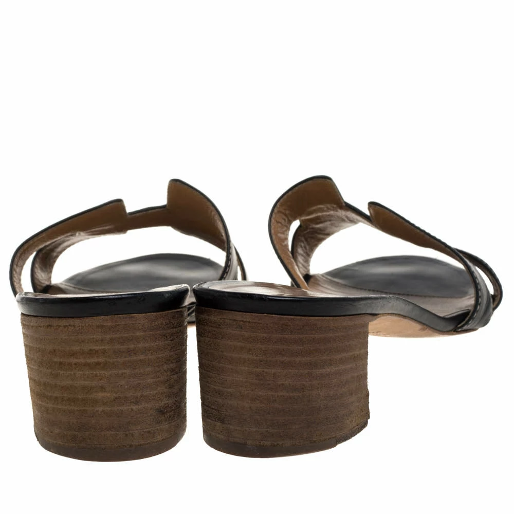 A seamless blend of luxury, comfort, and class is what you get when you slide your feet into these Hermes sandals. Crafted from black leather, they feature the signature H-shaped straps on the front and are set on comfortable block heels. These sandals can be easily styled with both casual and formal outfits.