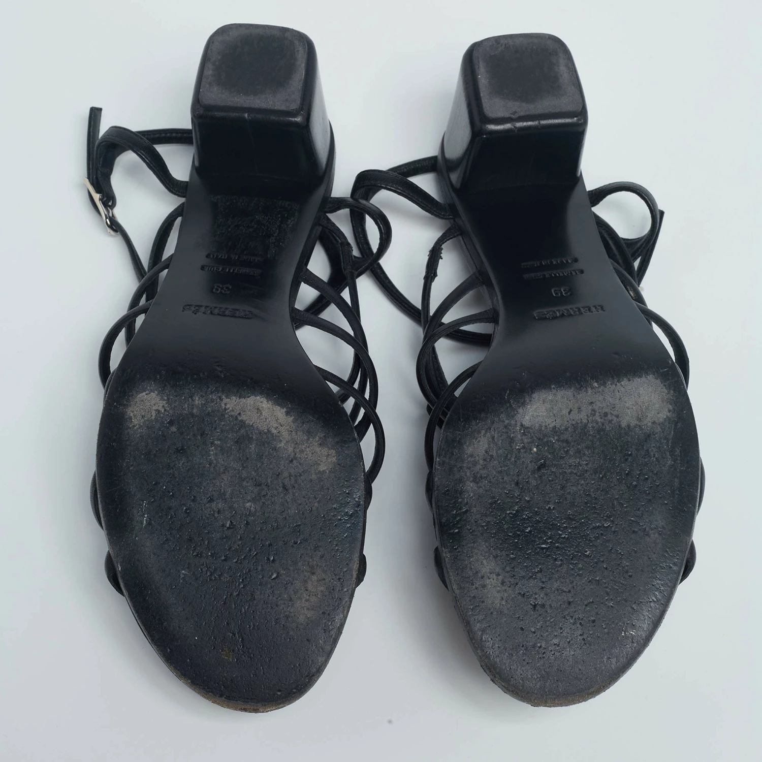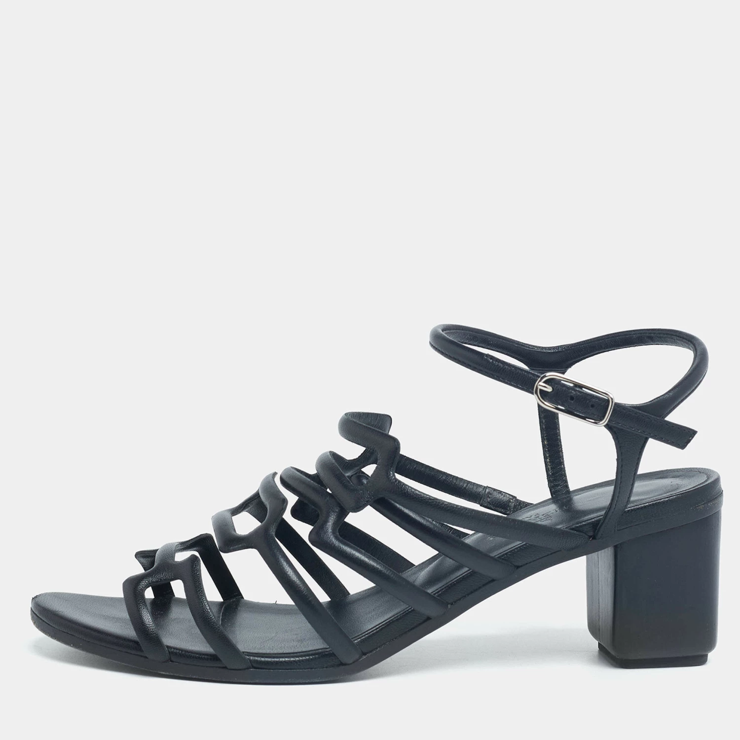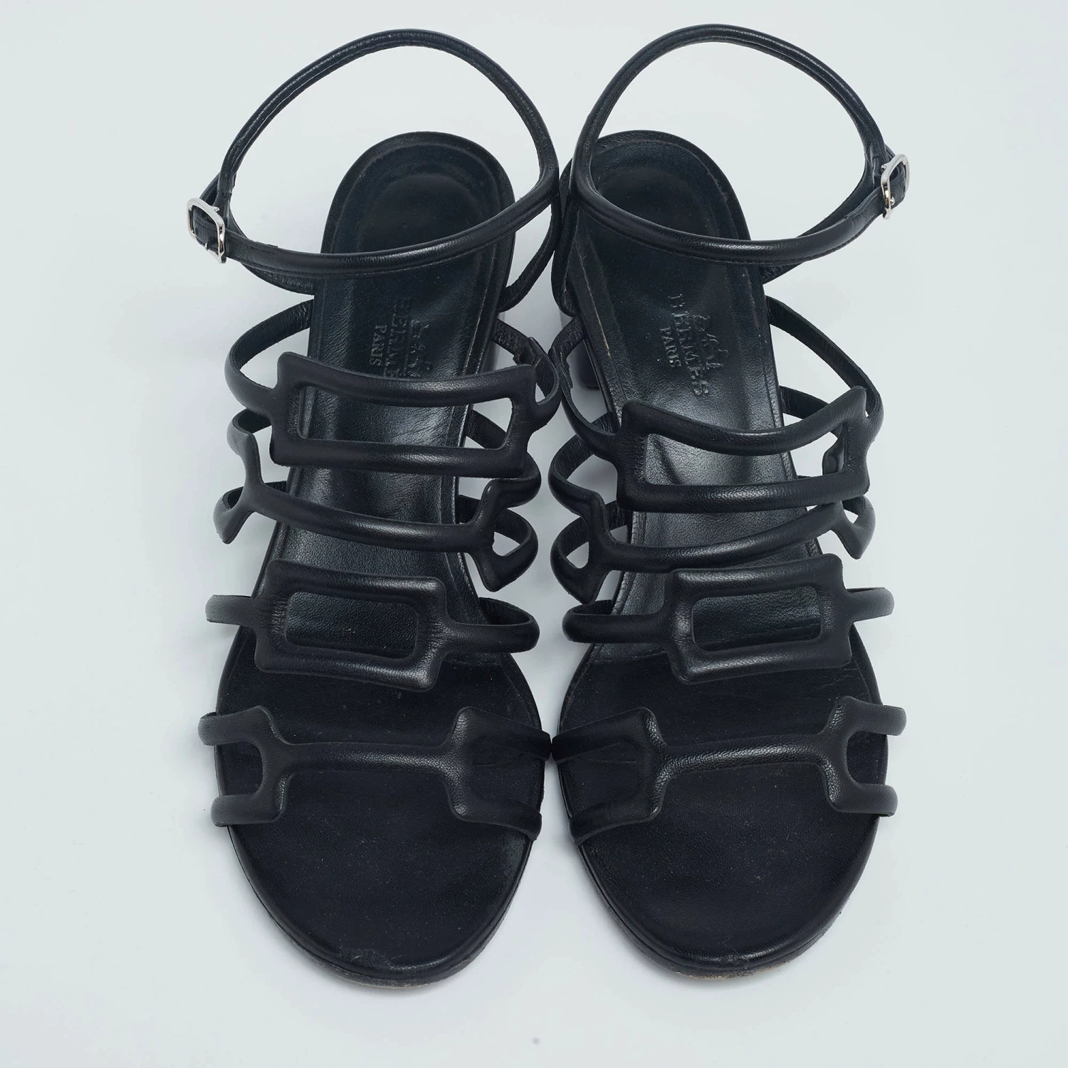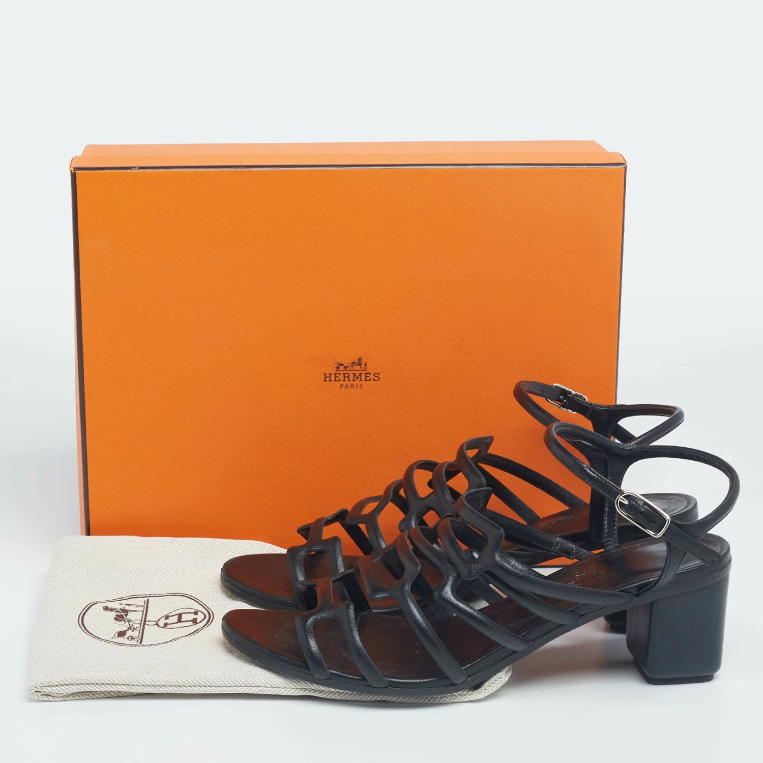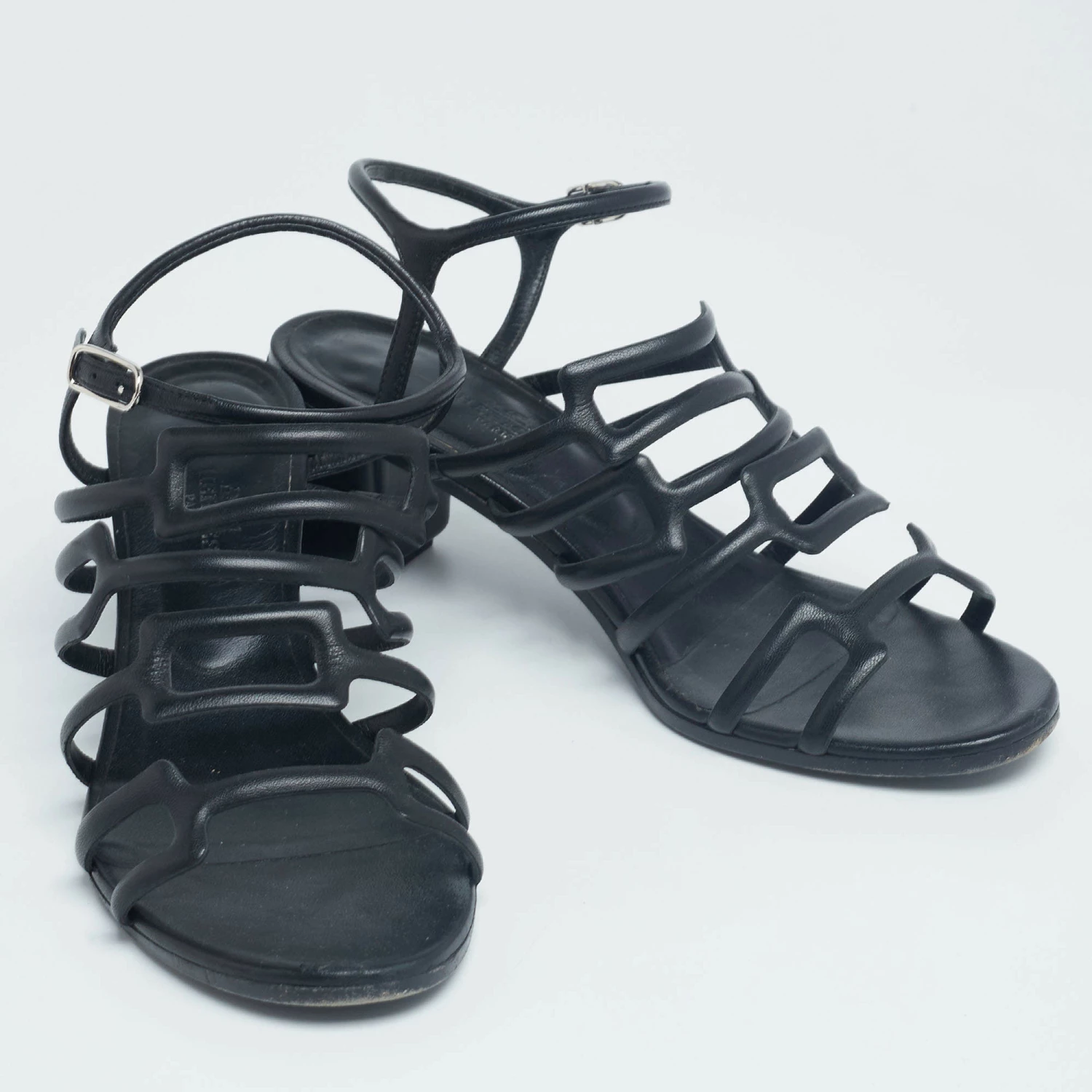 Make space in your closet for these stunning creations from Hermes. Crafted into a strappy design using leather, the black sandals come with silver-tone buckle closures. Block heels and sturdy soles finish this artistic pair.