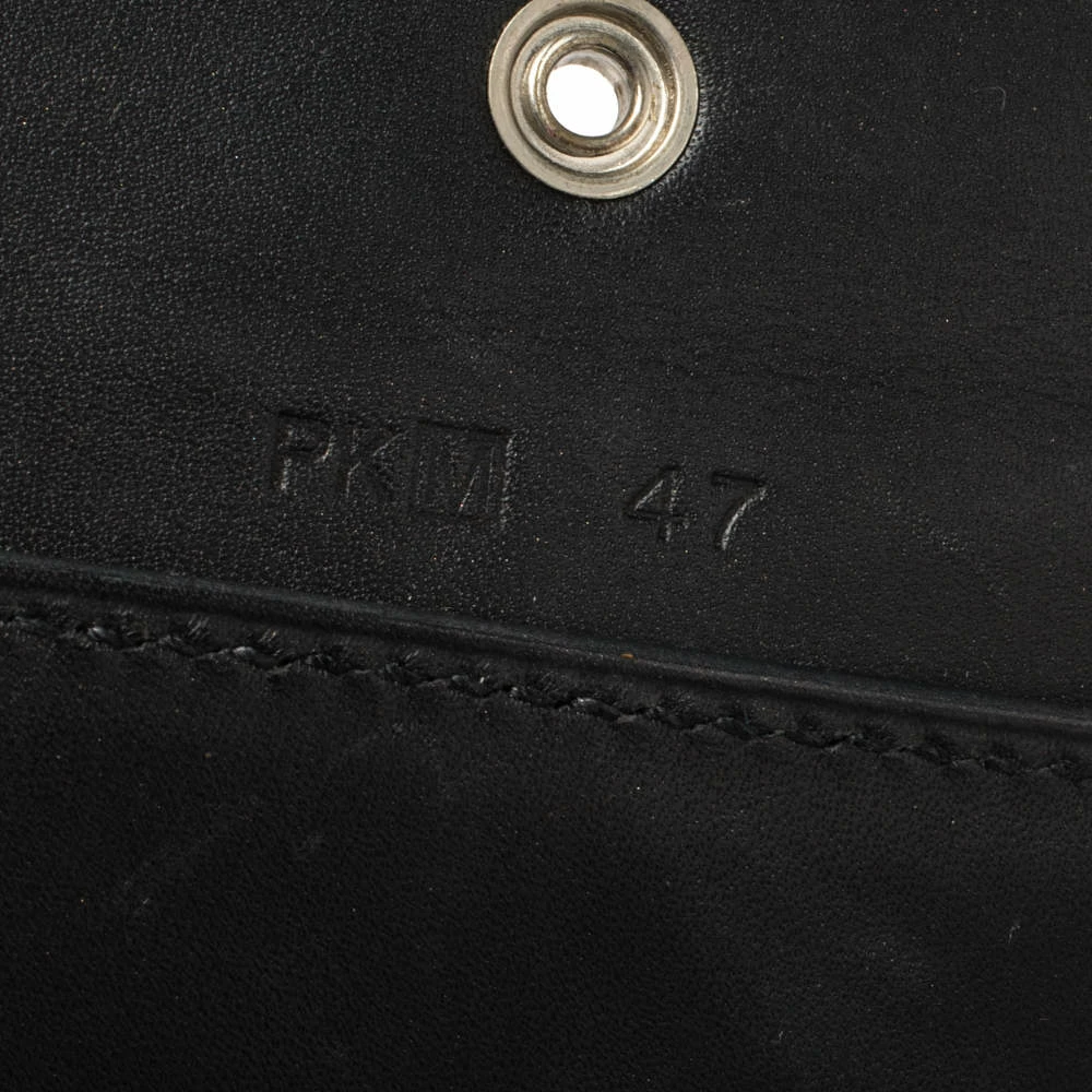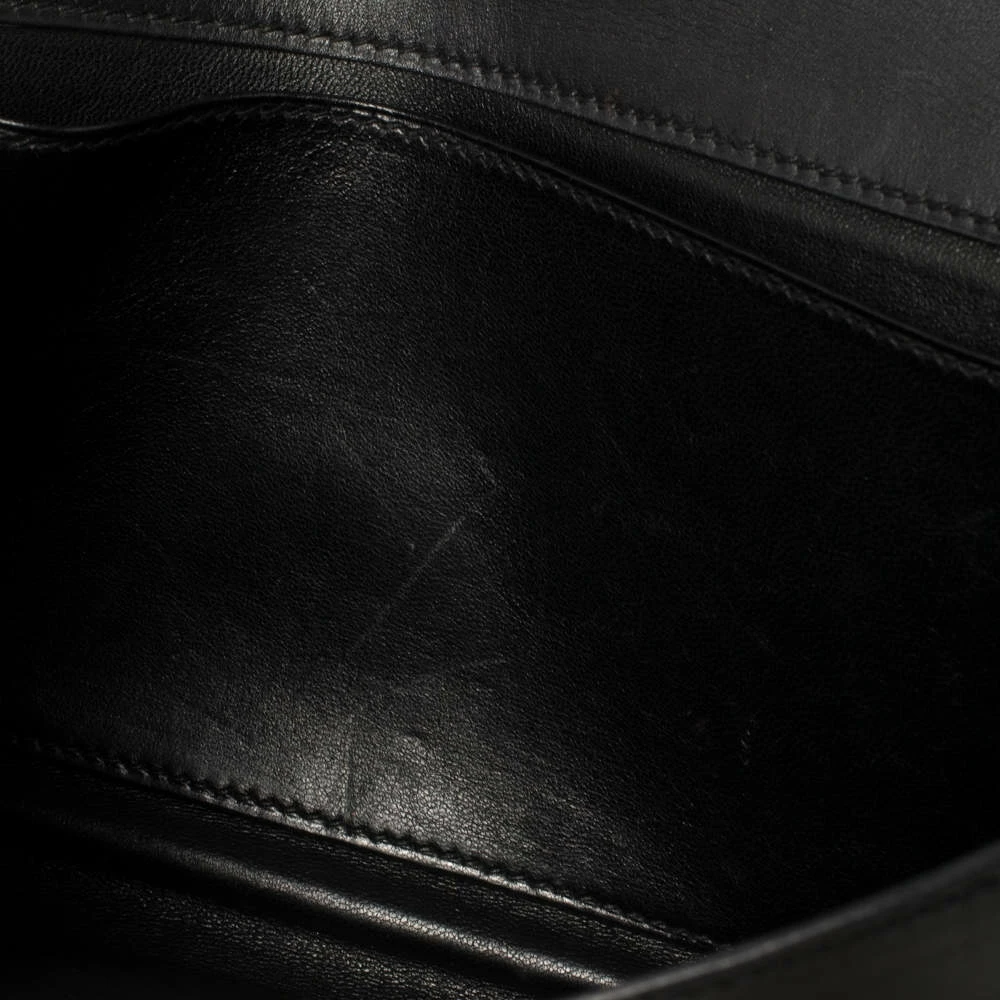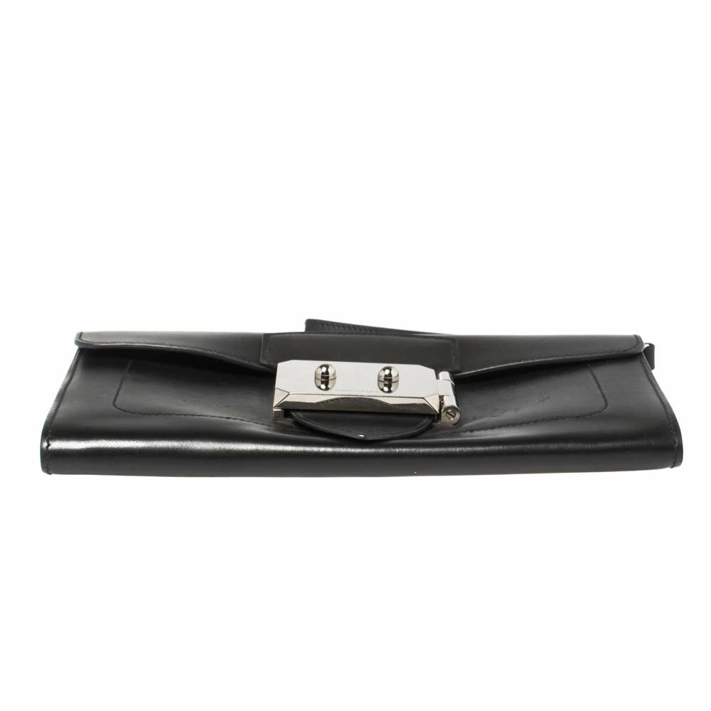 This Goodlock clutch from Hermes is a statement piece you must own! It has been crafted from black leather and adorned with a logo-engraved palladium hardware lock on the front flap. It opens to a leather interior that can easily accommodate your cash, cards, and keys and is equipped with a wristlet loop. Complete with neatly stitched edges, this creation will be an amazing buy.