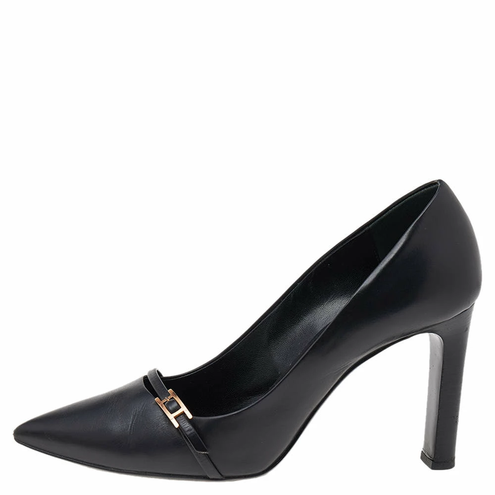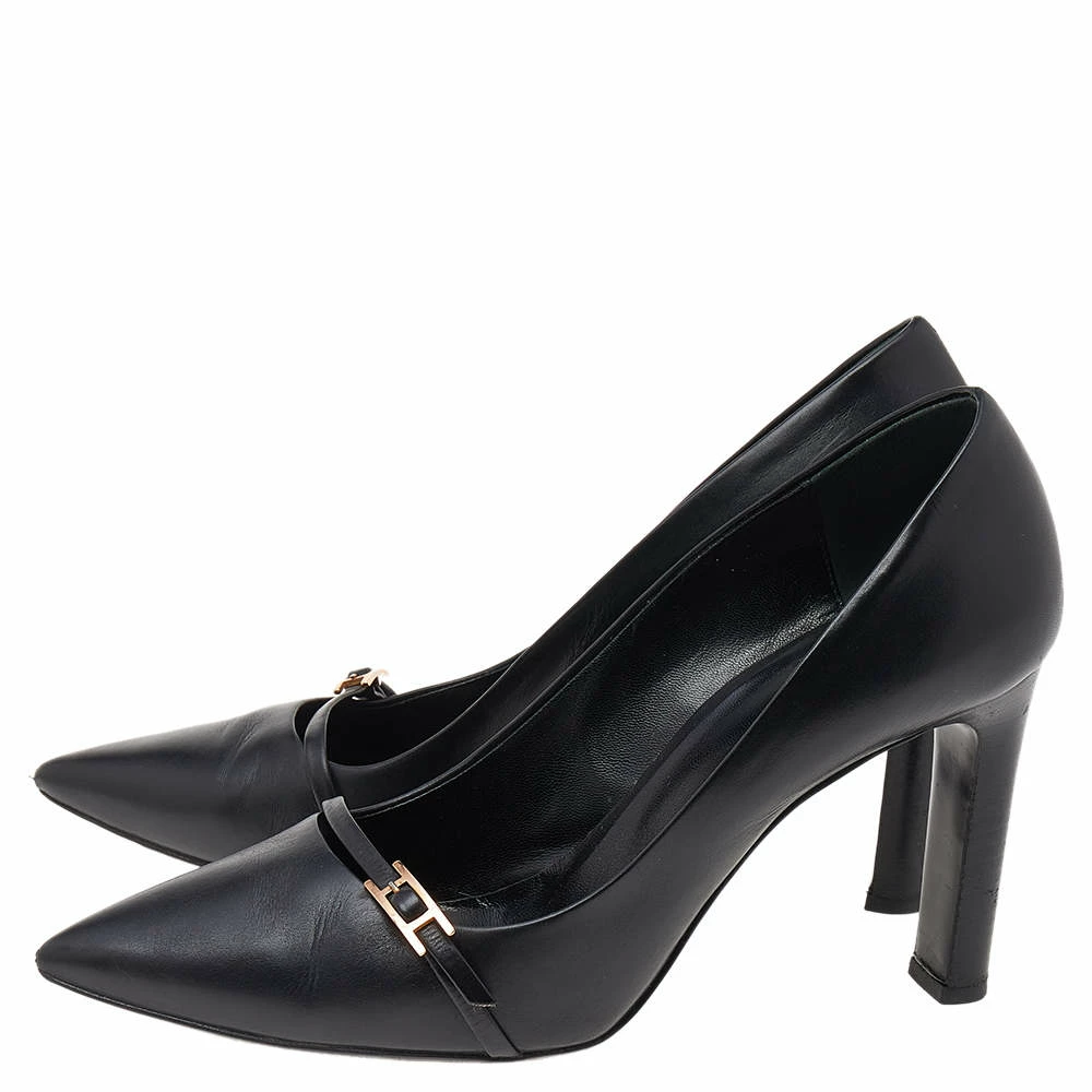 You can never go wrong with these classic pumps from the house of Hermes. Crafted from leather, they come in a shade of black They are styled with pointed toes, H strap detailing, 9.5 cm heels, and insoles carrying the brand label.